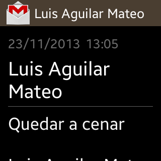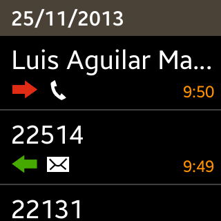 Durante el uso normal del reloj, cuando llega una notificación el teléfono vibra y suena (si se ha establecido así en las opciones) y la pantalla muestra información sobre la notificación que ha llegado. Pulsando sobre ella se accede a más detalles.