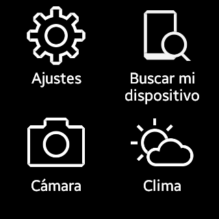 Ajustes permite acceder a las opciones del Galaxy Gear, tales como reloj, sonido, volumen, pantalla, batería, Bluetooth, Movimiento, Bloqueo privacidad, Idioma, Reestablecer Gear e Información.
