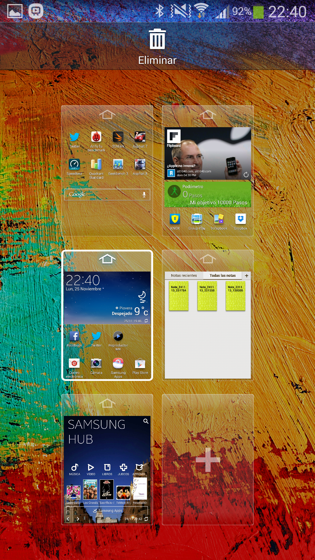 En el escritorio del Samsung Galaxy Note 3 podemos tener hasta siete pantallas diferentes, y asignar cualquiera de ellas como página principal. La parte inferior está ocupada por cinco iconos que permanecen visibles en todas las pantallas del escritorio, y que podemos elegir a nuestro gusto. La transición entre las pantallas del escritorio se realiza con un vistoso efecto 3D.