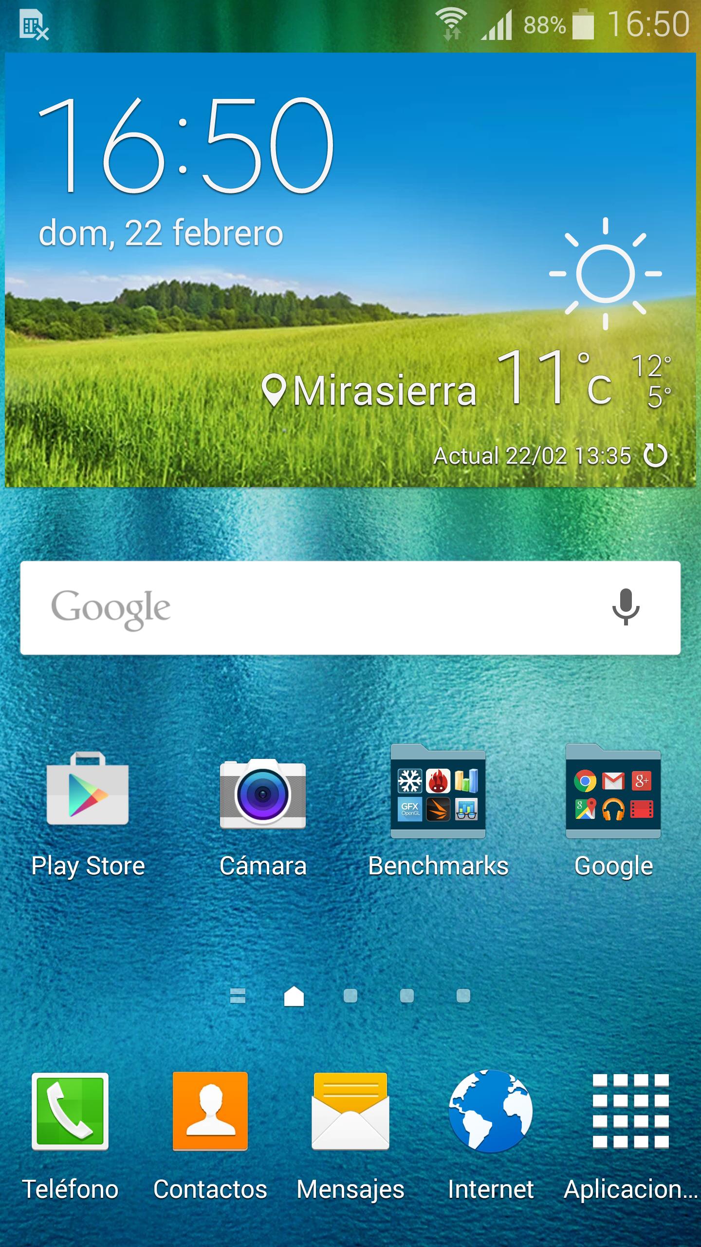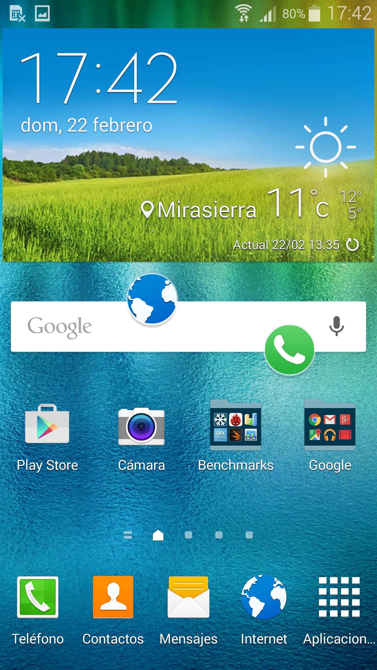 Por defecto la pantalla principal muestra un widget con la hora y la temperatura, la barra de búsqueda de Google, y queda espacio para colocar cuatro iconos de aplicaciones en el escritorio.