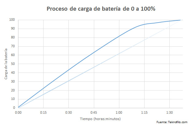 El proceso de carga completo es de tan solo 1 hora y 40 minutos, utilizando el cargador rápido incluido en la caja .La carga hasta un 90% se realiza en 1h 10m, pero el 10% restante lleva 30 minutos adicionales.