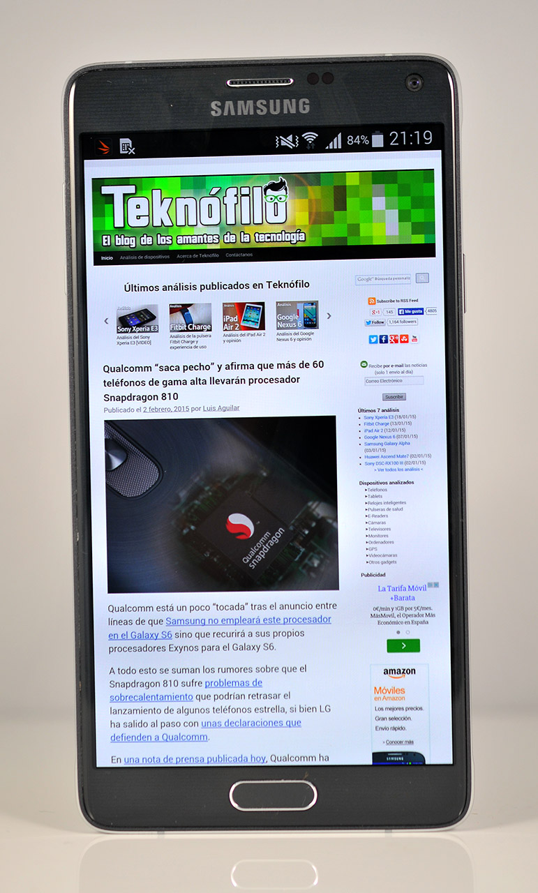 Los ángulos de visión son excelentes y el brillo máximo también es muy elevado, por lo que no tendremos problemas para ver en la pantalla a plena luz del día. El Galaxy Note 4 incorpora un modo de pantalla llamado Pantalla adaptable que está activado por defecto y optimiza automáticamente la nitidez, saturación y definición de la pantalla para ciertas aplicaciones como Galería, Cámara, Internet, Vídeo,y Google Play Libros.
