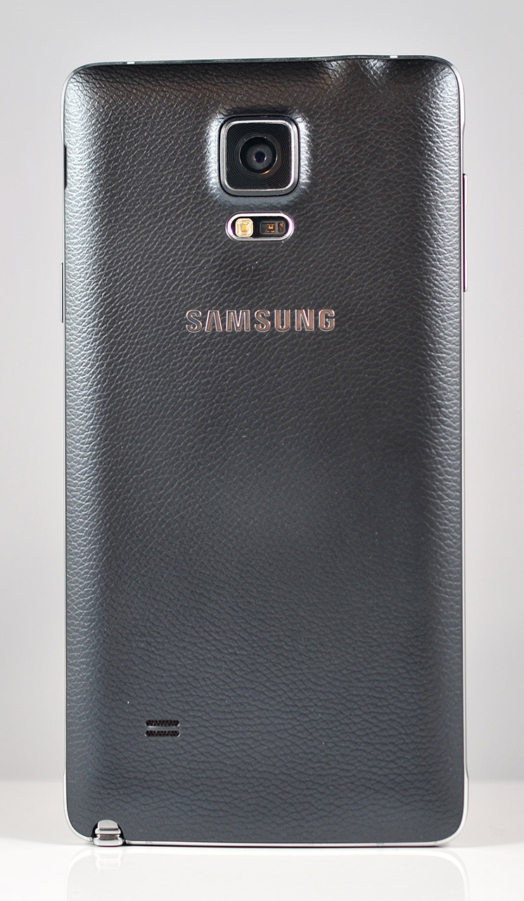 Samsung ha tratado de dar un aspecto sofisticado a la tapa trasera de plástico del Galaxy Note 4 con una textura que imita a la piel. El Galaxy Note 3 ya utilizaba este recurso e incluso incorporaba un falso pespunte que afortunadamente no está presente en el nuevo modelo ya que resultaba bastante artificial.