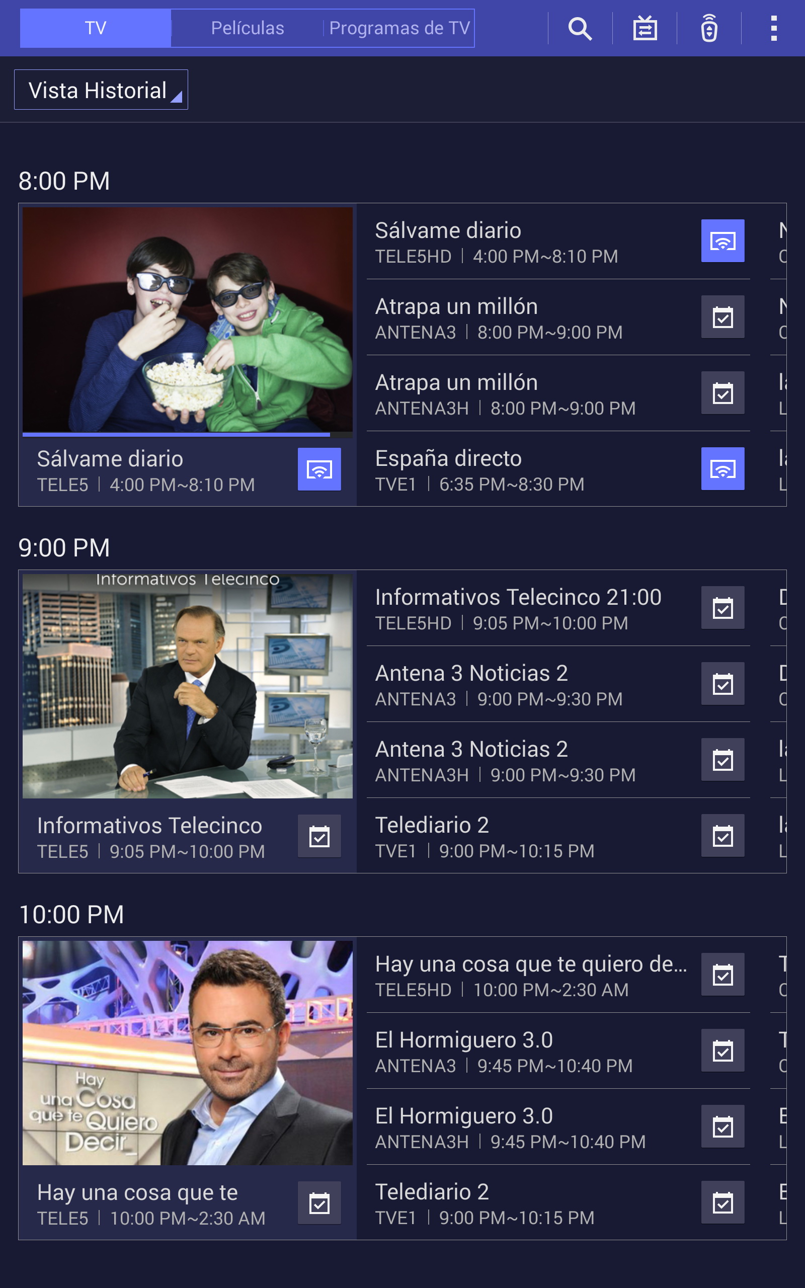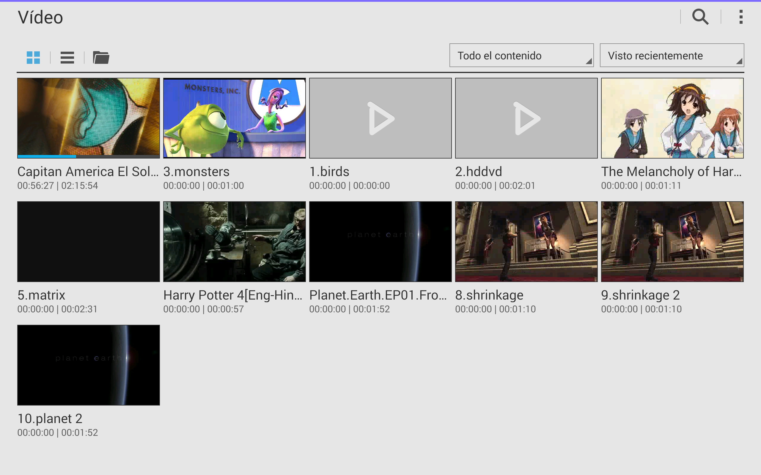 La aplicación de Vídeos muestra inicialmente una vista con las películas en miniatura almacenadas en el tablet, que además están animadas, y también se puede acceder a otras vistas como Lista o Carpetas.