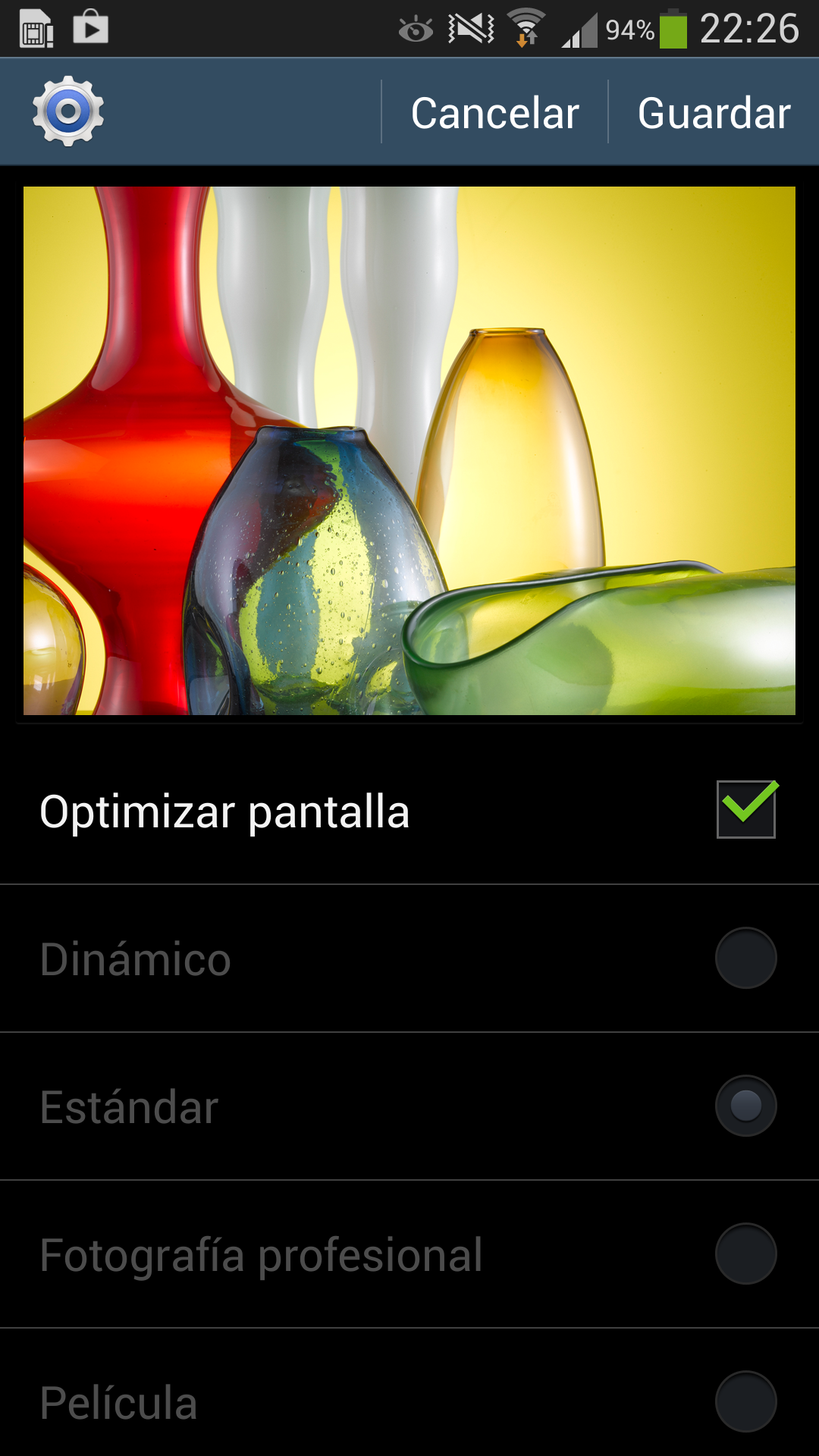 Para compensar esta debilidad, al igual que en el Galaxy Note II, Samsung ha incluido en el Galaxy S4 un ajuste de la pantalla que permite elegir el modo de reproducción de la imagen: Dinámico, Estándar, Fotografía Profesional y Película, así como un ajuste adicional llamado «optimizar pantalla» que se puede seleccionar en todos los modos.