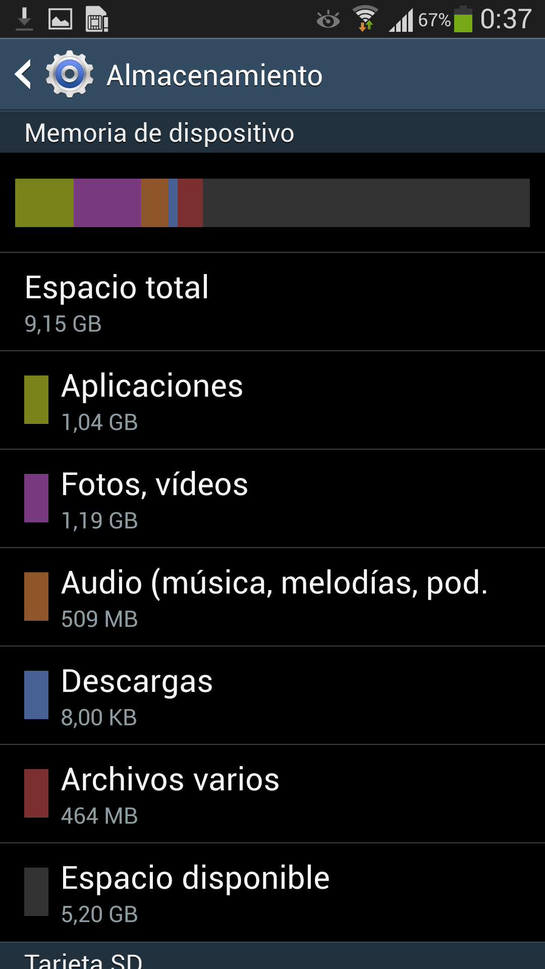 - Memoria interna de 16 GB con tan solo 9 GB libres para el usuario. A día de hoy no es posible instalar aplicaciones en la memoria micro-SD ya que la actualización que lo habilita aún no se ha comenzado a distribuir en España.