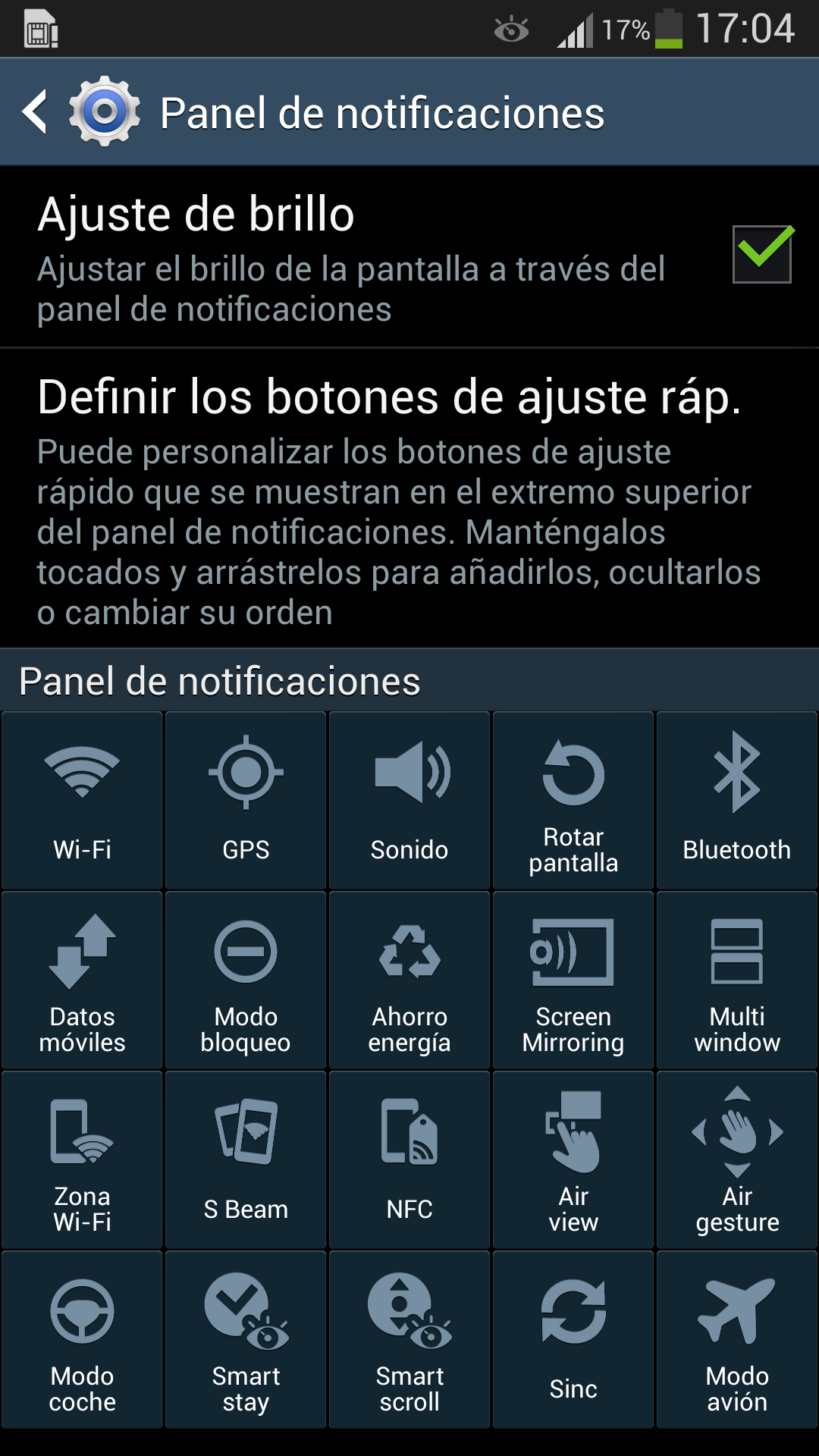 El panel de notificaciones del Samsung Galaxy S4 también ofrece algunas mejoras interesantes respecto a Android original. Además de permitir ajustar el brillo automáticamente, permite acceder directamente al menú de configuración y ofrece accesos directos a 20 ajustes distintos: Wi-Fi, GPS, Sonido, Rotar pantalla, Bluetooth, etc.