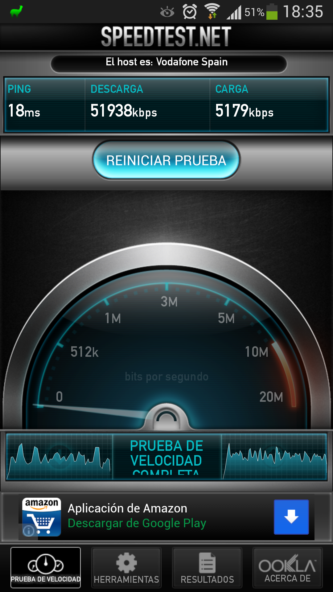 En las pruebas que hemos realizado la velocidad de red tanto por Wi-Fi como por 3G fueron muy satisfactorias. En las pruebas de velocidad el Galaxy S4 alcanzó los 52 Mbps de bajada y 5,2 Mbps de subida en Wi-Fi con una conexión de fibra óptica, y 10,7 Mbps de bajada y 1,2 Mbps de subida con una conexión 3G de Movistar.