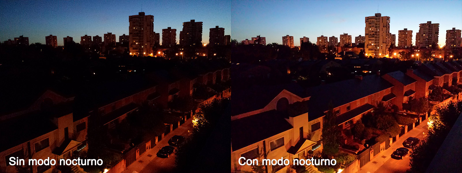 A continuación podemos ver un ejemplo de una fotografía con poca luz tomada sin y con el modo Nocturno. Como podemos apreciar, el modo Nocturno deja pasar más luz que el modo automático para que la escena salga más iluminada.