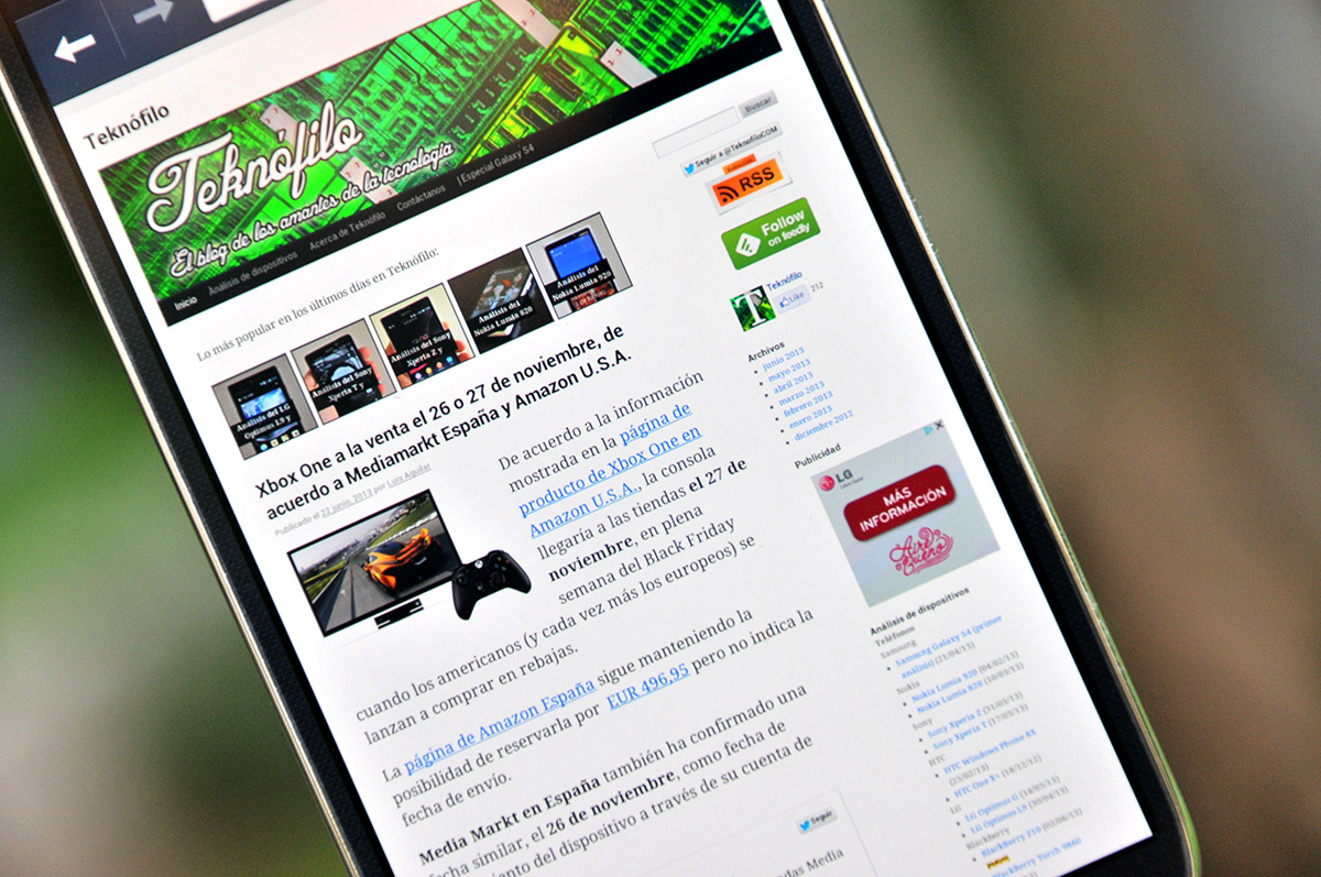 Ahora bien, dado que el ojo humano sin entrenar no parecer ser capaz de distinguir por encima de 287 ppp, la tendencia actual de dotar a las pantallas de densidades de píxeles muy por encima de 300 ppp resulta ser más un reclamo publicitario que una característica a valorar. De hecho, hemos colocado un LG Optimus G (4,7″, 318 ppp) junto al Galaxy S4 (5″, 441 ppp) y al acceder a una web con texto pequeño (como la de elmundo.es) no hemos apreciado que los textos pequeños se leyeran mucho mejor en uno que en otro.
