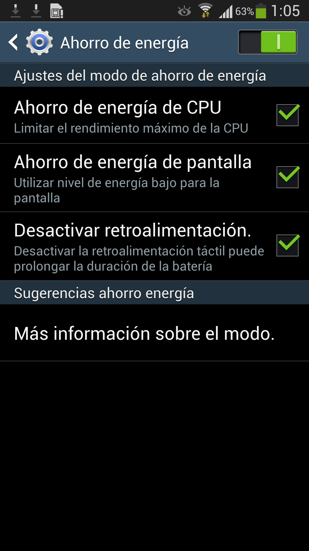 Además Samsung ha incorporado varias opciones de ahorro de energía mediante la limitación del rendimiento máximo de la CPU, reducción del nivel de brillo de la pantalla o desactivación de la respuesta táctil de la pantalla.
