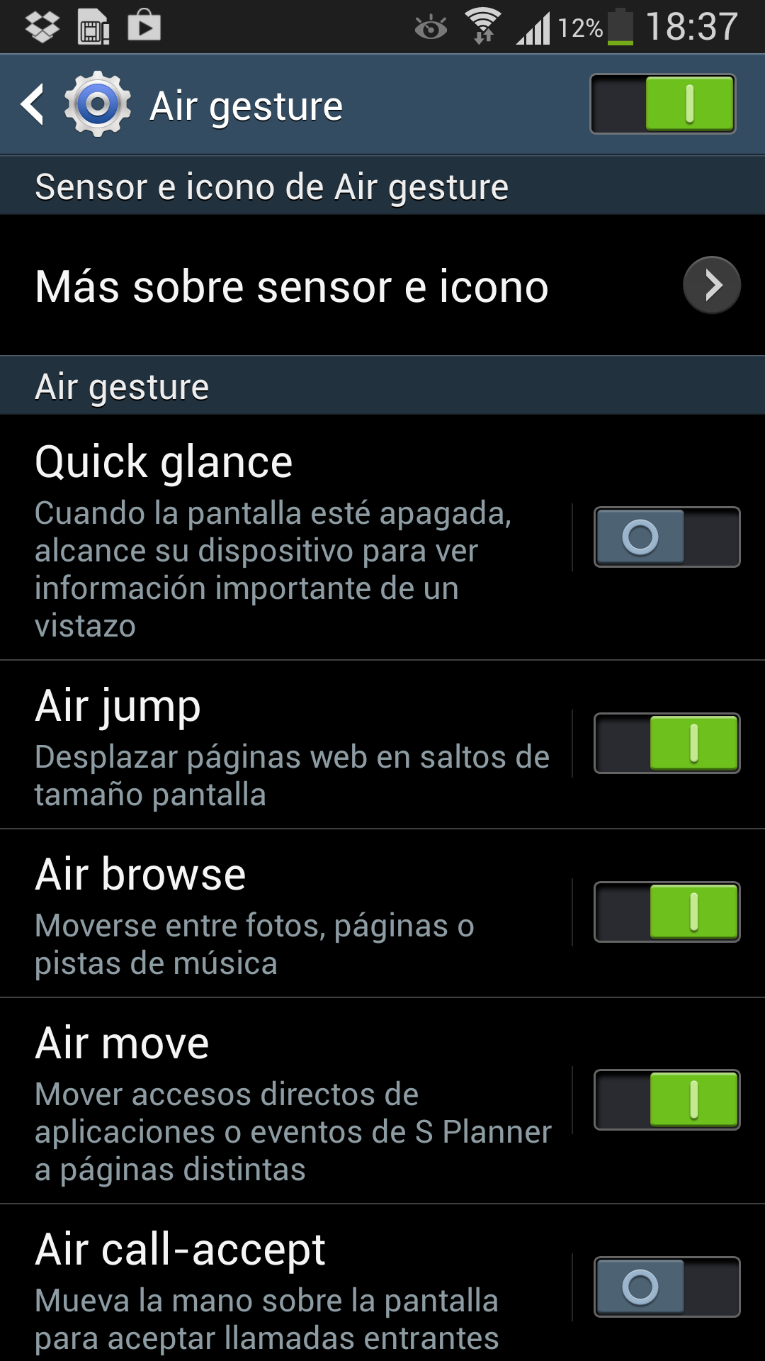 - Air Browse: Pasar al elemento anterior o siguiente moviendo la mano a izquierda o derecha encima del sensor en la galería, navegador, reproductor de música y S Memo.