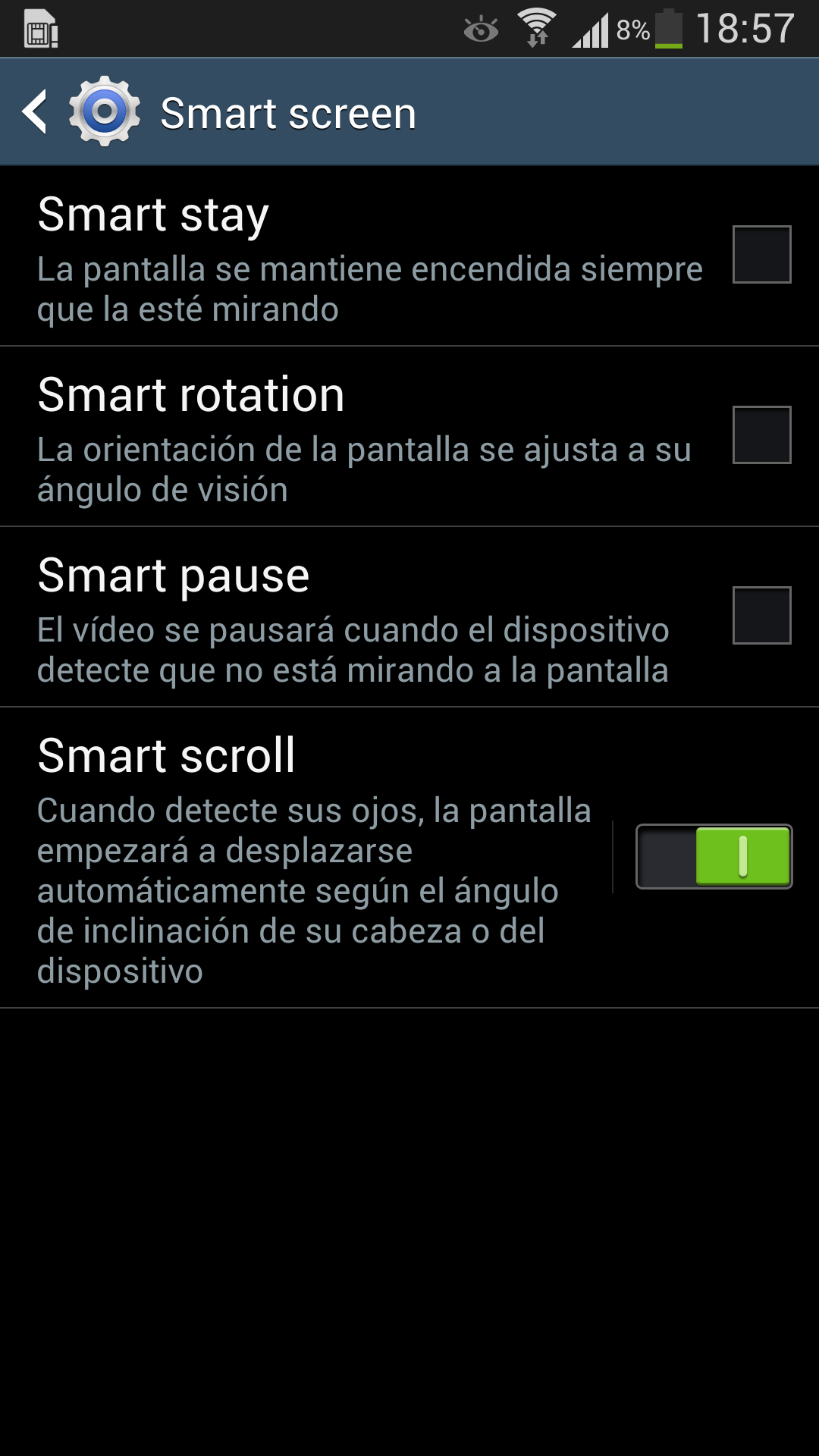 - Smart Stay: La pantalla permanece encendida siempre que se esté mirando.