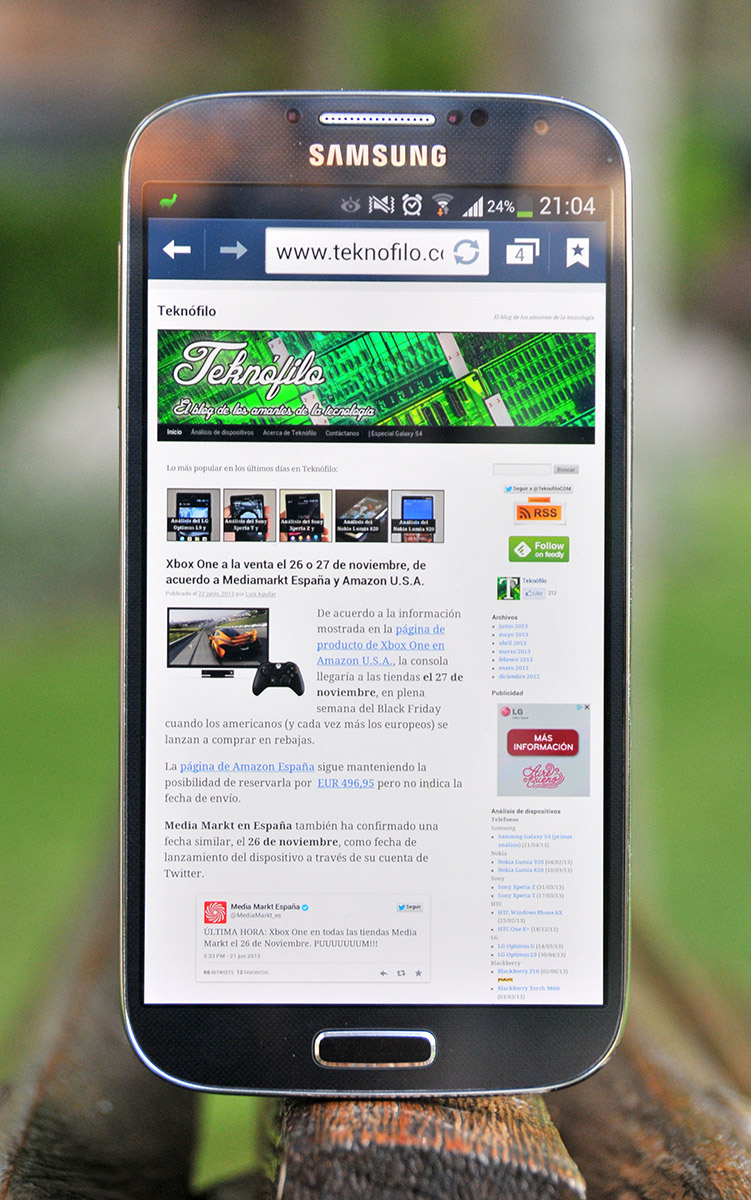Ahora bien, dado que el ojo humano sin entrenar no parecer ser capaz de distinguir por encima de 287 ppp, la tendencia actual de dotar a las pantallas de densidades de píxeles muy por encima de 300 ppp resulta ser más un reclamo publicitario que una característica a valorar. De hecho, hemos colocado un LG Optimus G (4,7″, 318 ppp) junto al Galaxy S4 (5″, 441 ppp) y al acceder a una web con texto pequeño (como la de elmundo.es) no hemos apreciado que los textos pequeños se leyeran mucho mejor en uno que en otro.