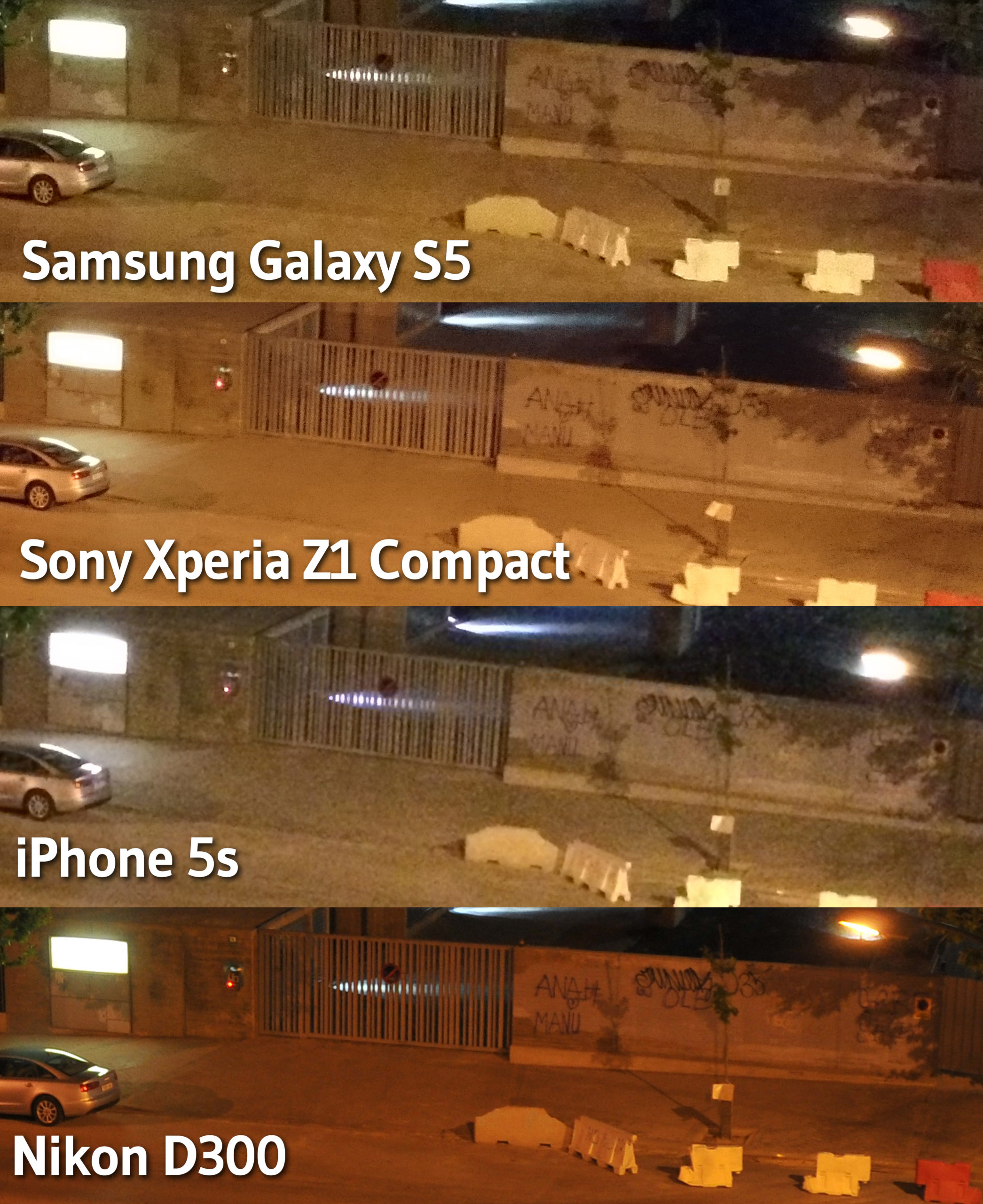 A continuación hemos repetido la misma prueba en una escena nocturna para apreciar el rendimiento del sensor con poca luz. En esta ocasión la mayor calidad la ofrece la cámara réflex, como era de esperar por su sensor de mayor tamaño. Sin embargo el Galaxy S5 ofrece un resultado bastante razonable, a la par del Sony Xperia Z1 Compact.