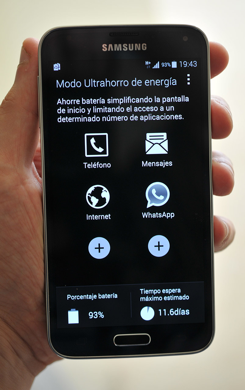 El modo ultrahorro es una de las novedades importantes que ha incorporado Samsung en el Galaxy S5, que incrementa significativamente la autonomía del teléfono en caso de necesidad.
