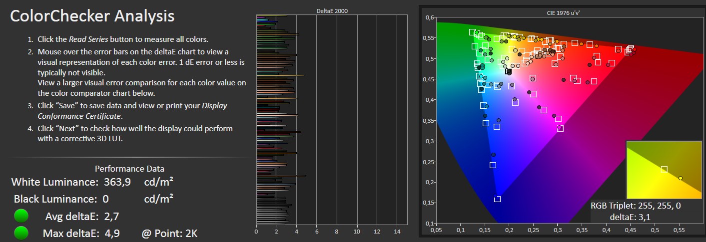 En este modo, la fidelidad de los colores es mucho menor, y obtenemos un error medio de 6.4 dE, y un error máximo de 14.4 dE