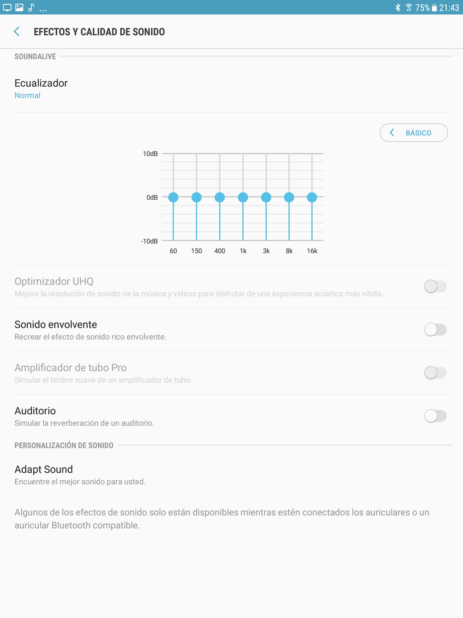 Samsung ha incorporado algunas funciones interesantes de sonido como Sound Alive para ajustar la ecualización; y Adapt Sound para calibrar el sonido emitido a través de los auriculares a la respuesta frecuencial de nuestro oído.