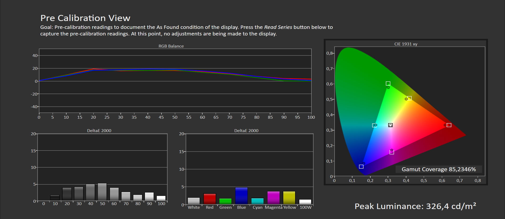 La temperatura de color es 6.490ºK, bastante cerca del nivel de referencia de 6.500ºK, lo que implica un color blanco puro sin ningún tinte de color.