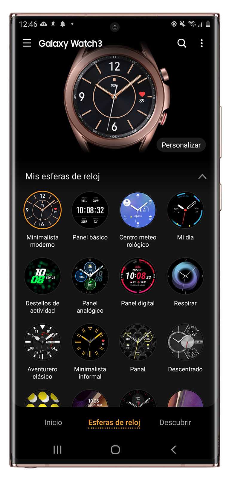 Con la aplicación Galaxy Wearable podemos emparejar mediante Bluetooth nuestro teléfono con el Galaxy Watch 3. Además, ofrece varias opciones de aplicaciones y ajustes, como veremos a continuación.
