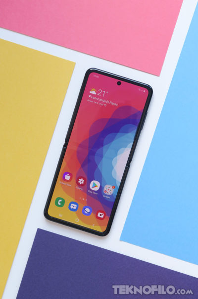 Al abrirlo, el Samsung Galaxy Z Flip despliega una gran pantalla de 6.7″ con con un orificio circular en la parte superior para la cámara frontal, como viene siendo costumbre en los últimos smartphones de Samsung de gama alta.