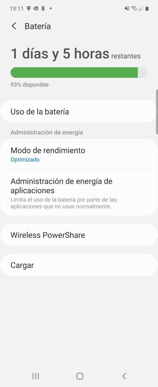 Samsung ha incorporado un sistema de carga rápida de 15W por cable, que no es de los más rápidos que hemos visto. El proceso de carga completo lleva cerca de 1 hora y 40 minutos. También cuenta con carga inalámbrica, en caso de que prefieras cargarlo sin cable.