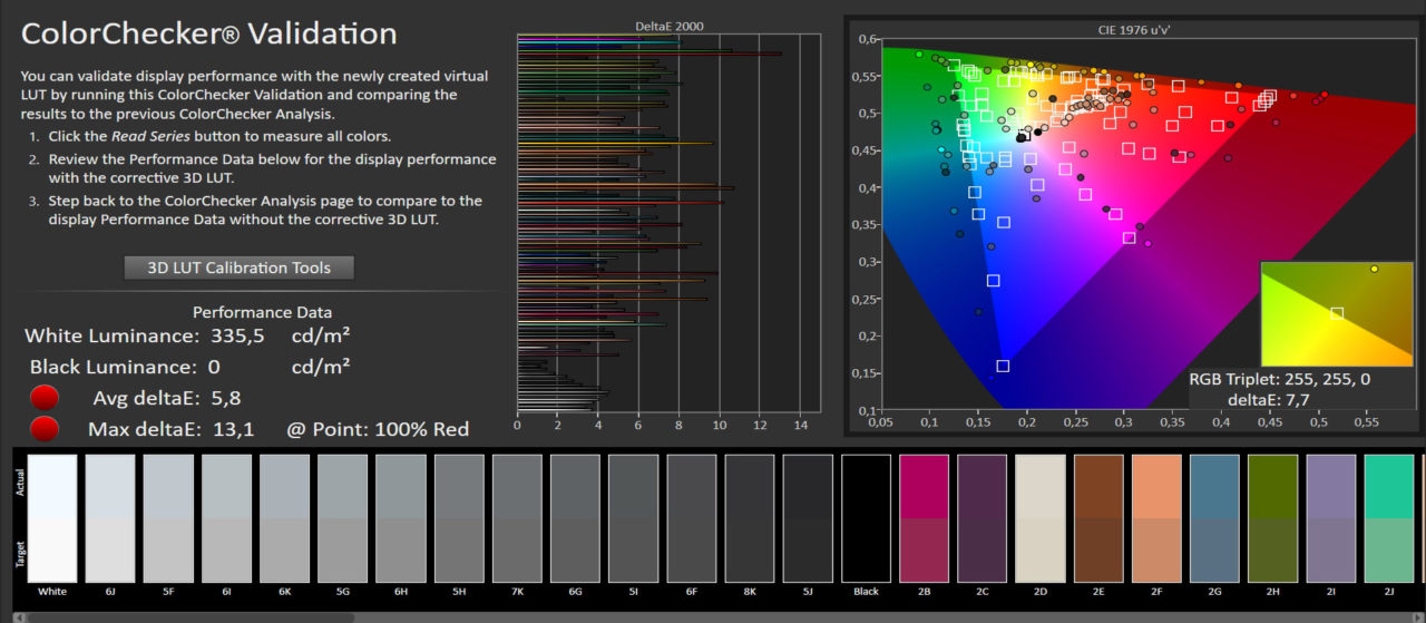 Debido al exceso de saturación de los colores que hemos comentado, la fidelidad de color del modo Intenso respecto al gamut sRGB es más baja. El error medio resulta ser 5.8 dE y el error máximo resulta ser también elevado, 13.1 dE.