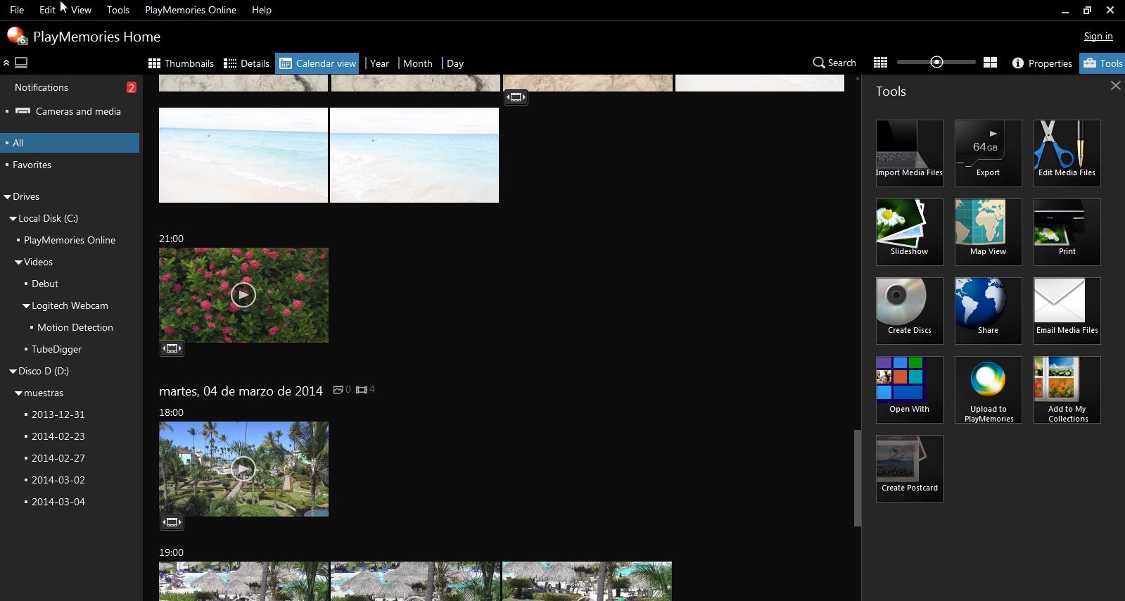 Otra forma más sencilla es mediante el uso del software gratuito PlayMemories Home, disponible para Windows o Mac, que transfiere automáticamente los vídeos o fotos en carpetas ordenadas cronológicamente y permite navegar mediante interfaz de calendario.