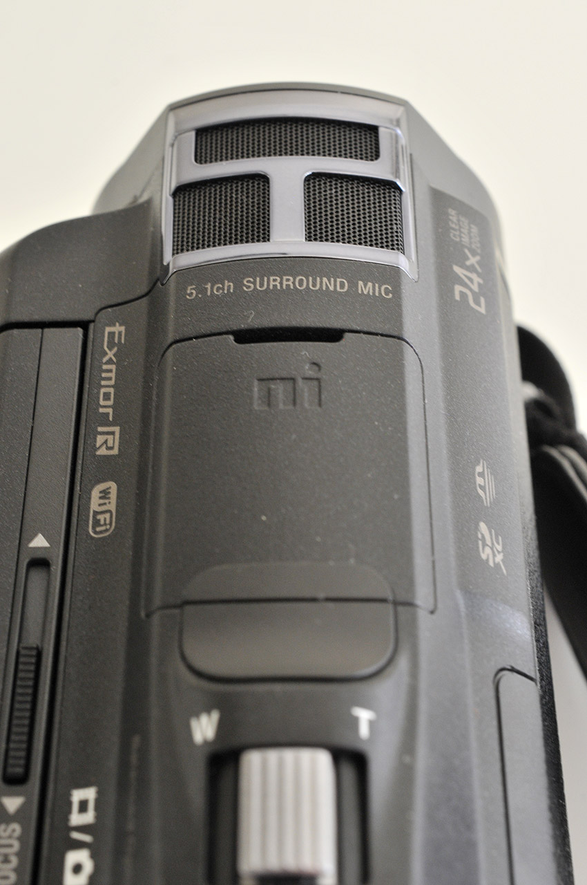 En la parte superior, empezando por la parte de delante, encontramos el micrófono 5.1, la zapata oculta por una tapa, el control de zoom y el botón de captura de fotografía.