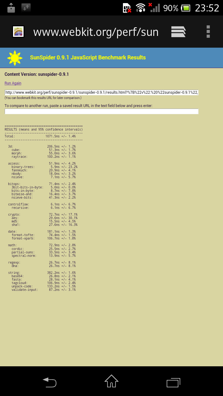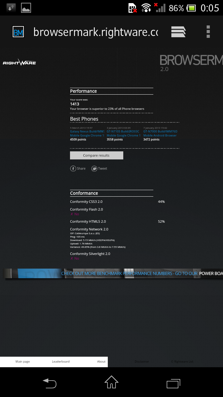 En las pruebas de navegadores, BrowserMark 2.0 ha dado como resultado 1.413 puntos, un 23% mejor que los navegadores de móviles y SunSpider ha dado 1.071 ms.