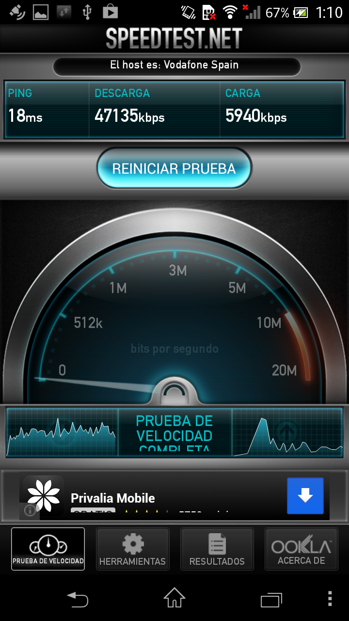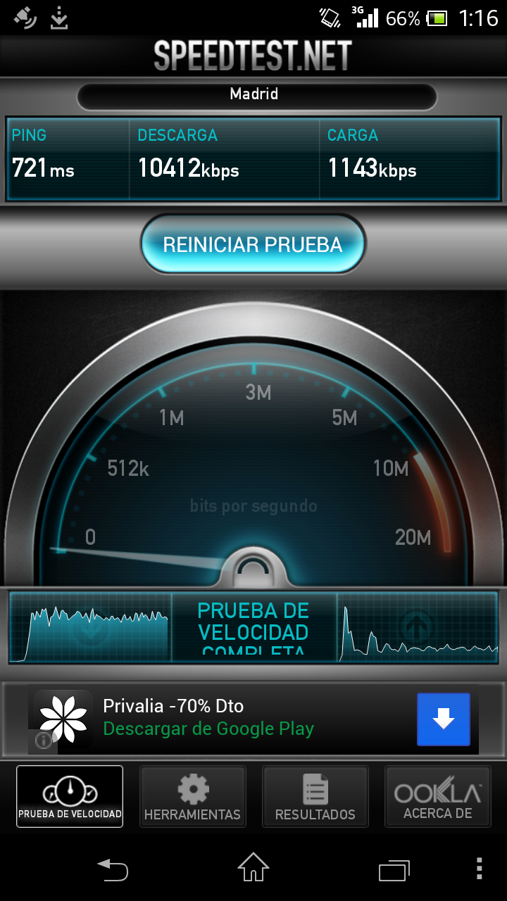 En las pruebas que realizamos la velocidad de red tanto por Wi-Fi como por 3G fueron muy satisfactorias. Las pruebas de velocidad alcanzaron 47 Mbps de bajada y 5,9 Mbps de subida en Wi-Fi con una conexión de cable de ONO, y 10,4 Mbps de bajada y 1,1 Mbps de subida con una conexión 3G de Movistar. Tanto en Wi-Fi como en 3G se trata de los mejores resultados que hemos visto en un teléfono móvil hasta la fecha.