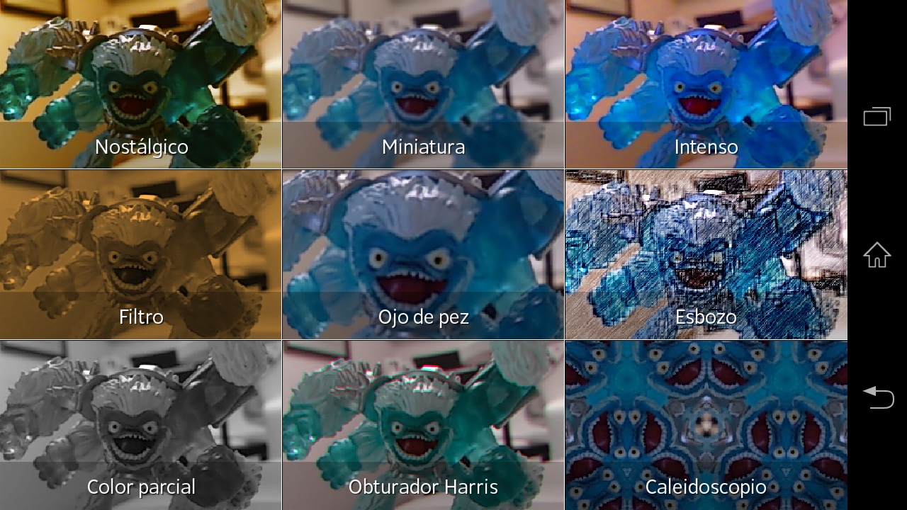 El modo de efecto de imagen permite escoger entre nueve efectos – nostálgico, miniatura, intenso, filtro, ojo de pez, esbozo, color parcial, obturador Harris y caleidoscopio – que se aplican y muestran en la pantalla en tiempo real sobre la imagen que captura la cámara.