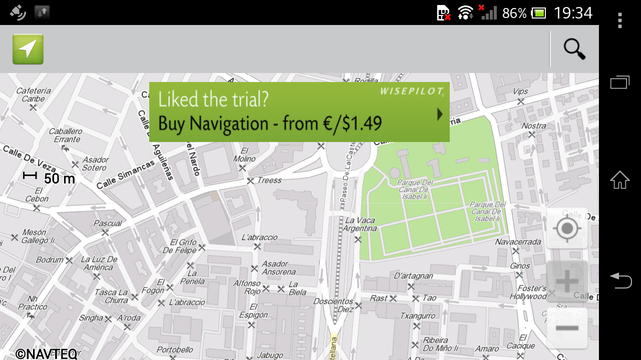 La aplicación Wisepilot for XPERIA es un software de mapas y navegación similar a Google Maps que incluye un gran número de puntos de interés. Como aspectos negativos, no muestra imágenes por satélite, la información de transporte público no está disponible en España (0 al menos a nosotros no nos funcionó), la funcionalidad de navegación es de pago y muestra recordatorios muy molestos incitándonos a pagar por ella (como se puede apreciar en la imagen adjunta).