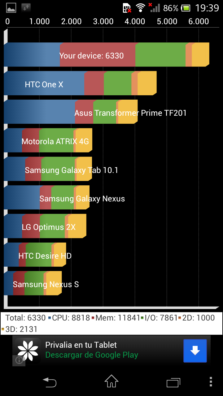 Estos resultados sintéticos confirman la sensación que tenemos al manejar el Sony Xperia T: el teléfono ofrece un buen rendimiento y, en el tiempo que lo hemos utilizado, apenas hemos experimentado parones o ralentizaciones. Donde se nota ligeramente la falta de potencia respecto a otros terminales es, por ejemplo, en la navegación web, ya que al hacer zoom o desplazarmos por páginas web complejas (como TheVerge.com) el Sony Xperia T se toma su tiempo para redibujar la porción de la página afectada.