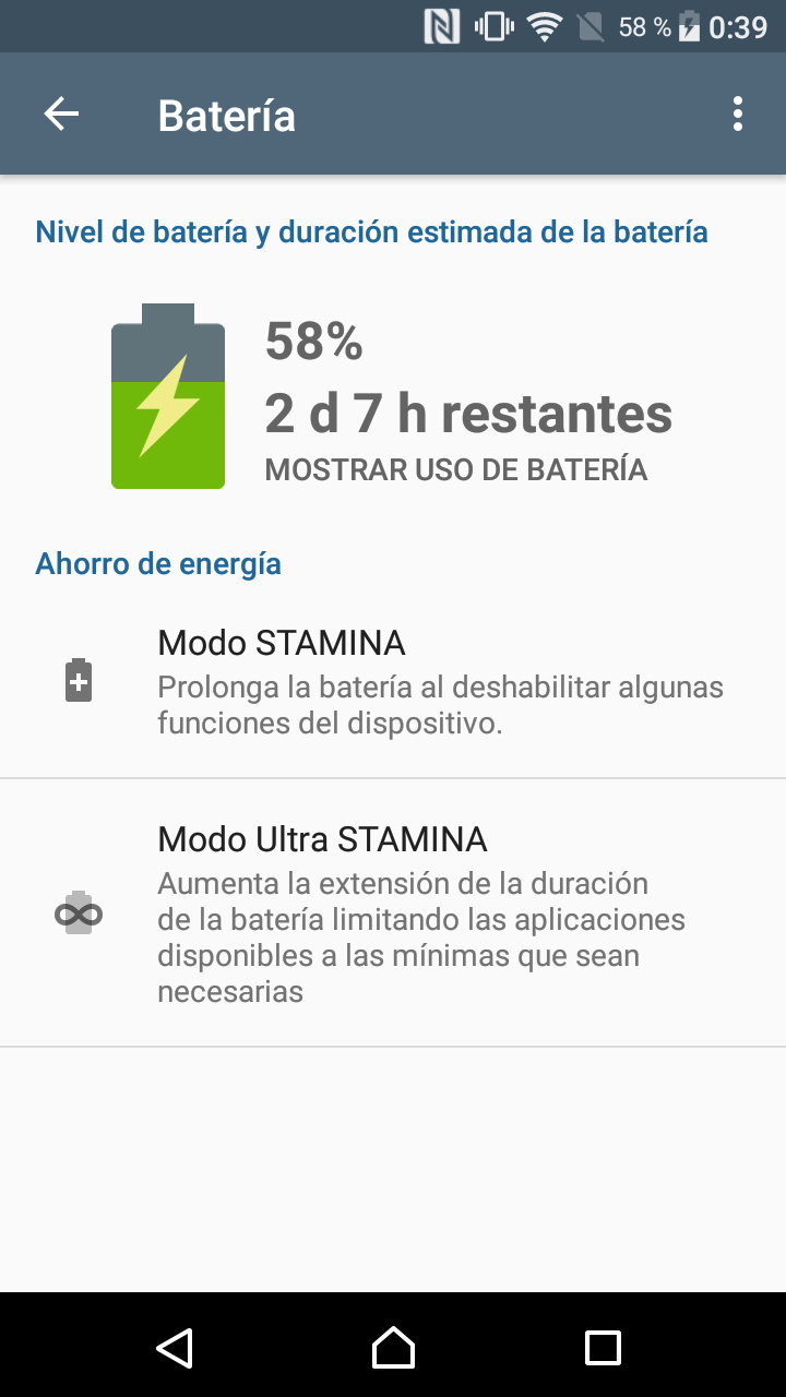 En la práctica, la autonomía del Xperia XA1 no pasa de ser correcta. Por suerte, Sony incorpora un buen número de funcionalidades Stamina que permiten extender la duración de la batería a costa de prescindir de ciertas funcionalidades.