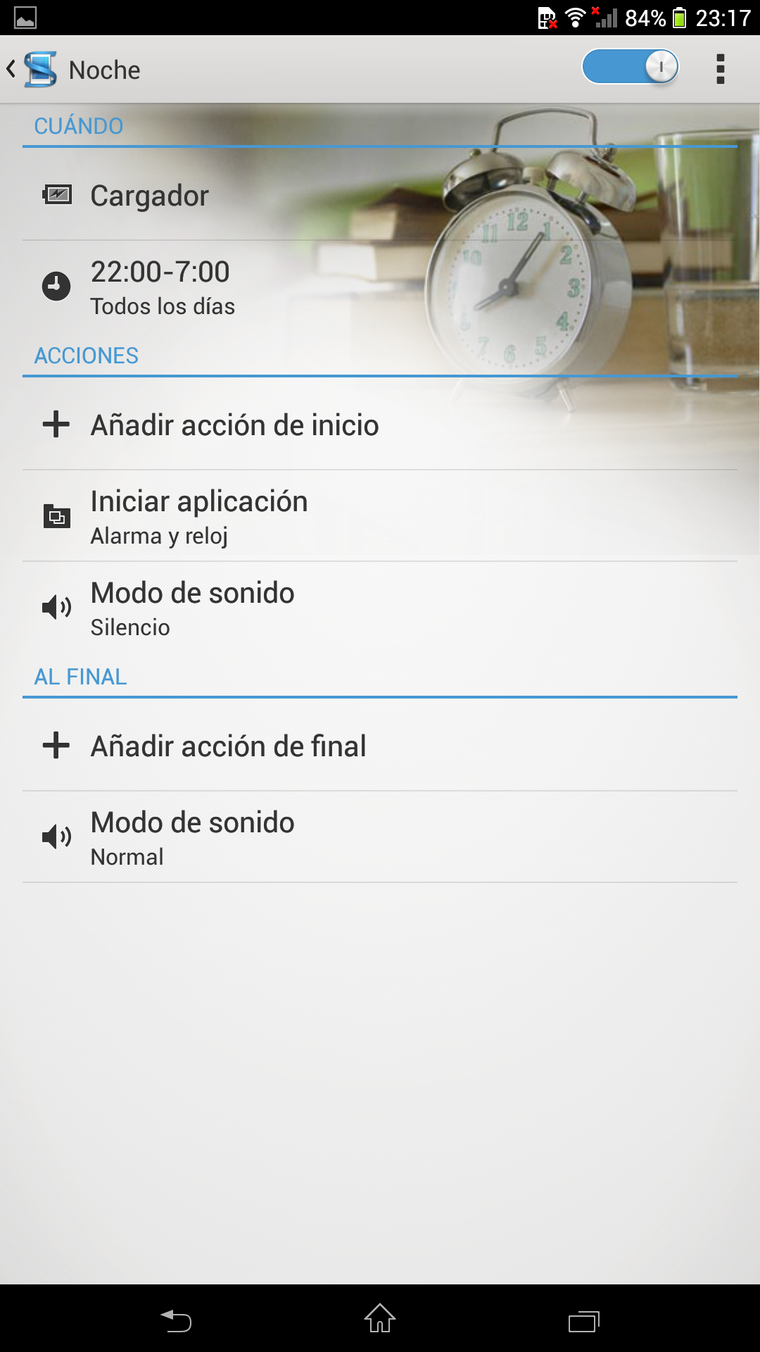 Por defecto nos encontramos con el perfil Noche predefinido que se activa entre las 2:00 y las 7:00 cuando el teléfono está conectado al cargador. El perfil Noche establece el modo de sonido Silencio y además inicia la aplicación ‘Alarma y reloj’, restableciendo posteriormente el modo de sonido Normal al terminar.