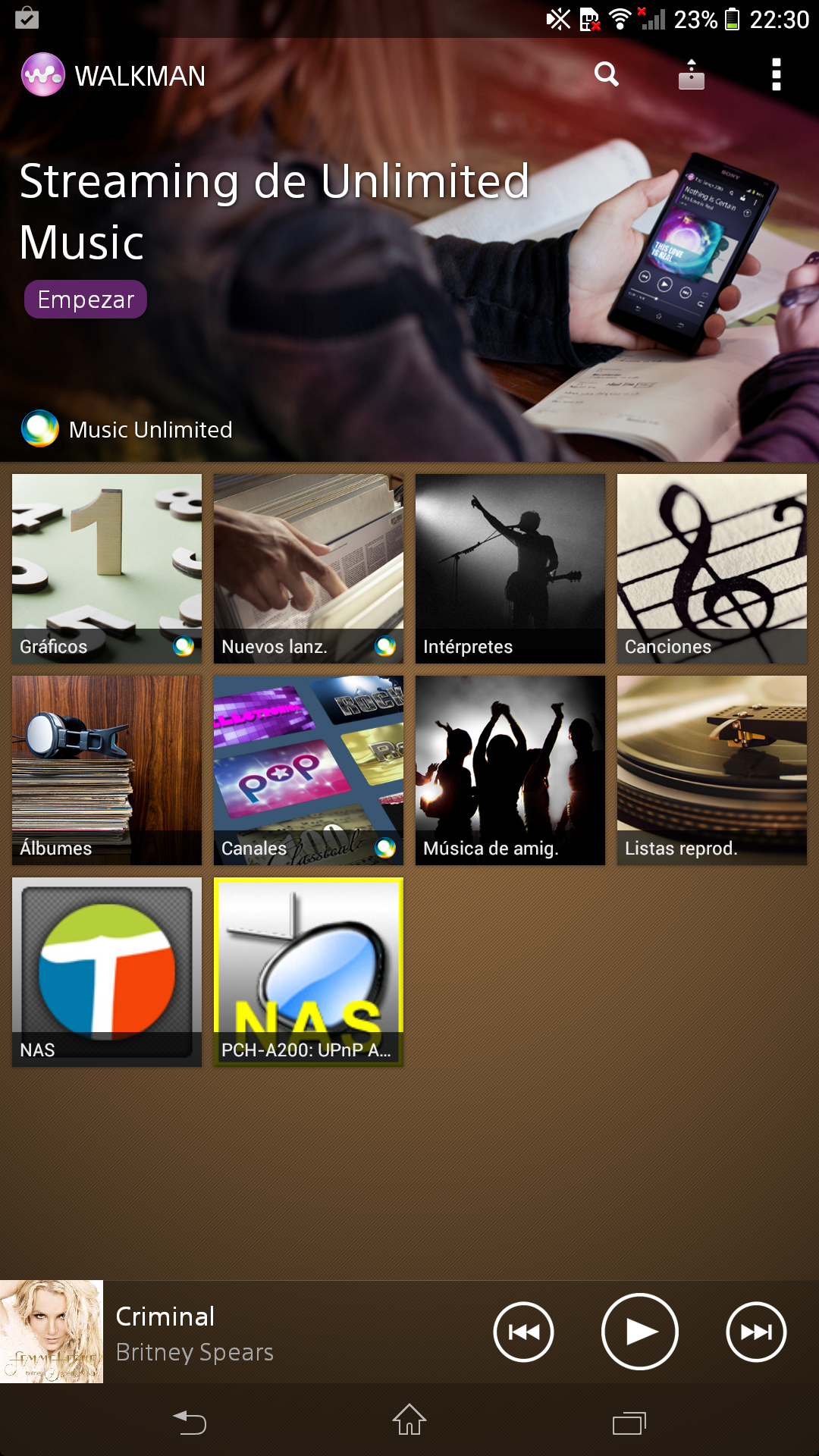 Centrándonos en las aplicaciones, Walkman reproduce canciones almacenadas en el teléfono y en servidores multimedia conectados a la misma red Wi-Fi.