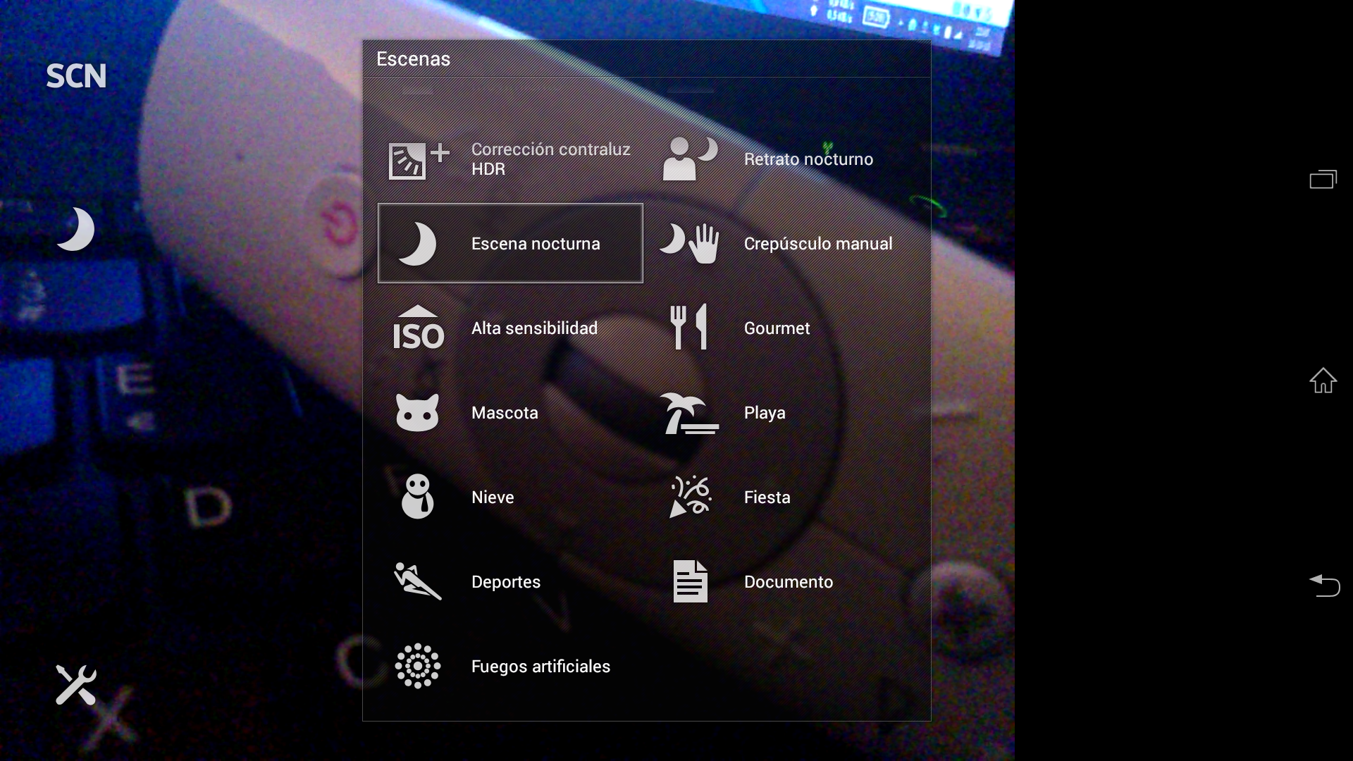 El modo escena permite elegir entre 17 escenas: piel suave (predeterminada), instantánea suave, antidesenfoque por movimiento, paisaje, corrección contraluz HDR, retrato nocturno, escena nocturna, crepúsculo manual, alta sensibilidad, gourmet, mascota, playa, nieve, fiesta, deportes, documento y fuegos artificiales.