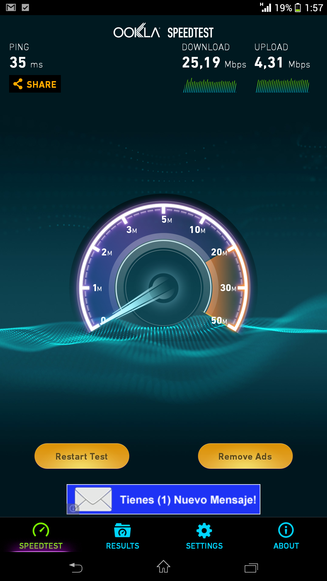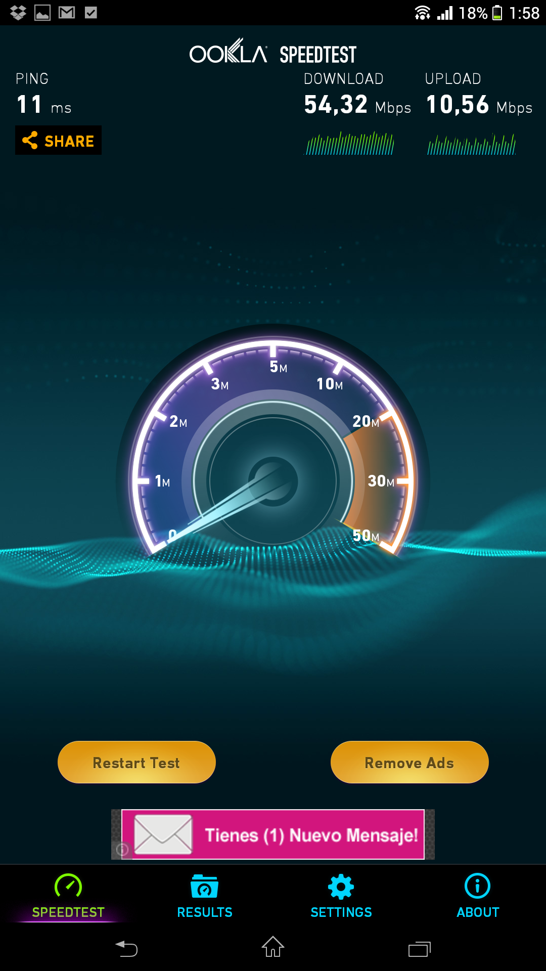 Se alcanzaron 54 Mbps de bajada y 10,6 Mbps de subida en Wi-Fi con una conexión de cable 100/10 de ONO, y 25 Mbps de bajada y 4,3 Mbps de subida con una conexión 4G de Vodafone.