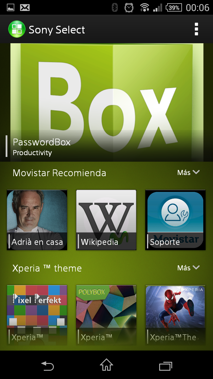 La aplicación Sony Select es un mercado de aplicaciones de Sony que rivaliza con Google Play Store aunque no aporta ningún valor diferencial y no resulta especialmente intuitiva de manejar. Xperia Lounge ofrece el acceso a vídeos por streaming, muchos de los cuales son conciertos.