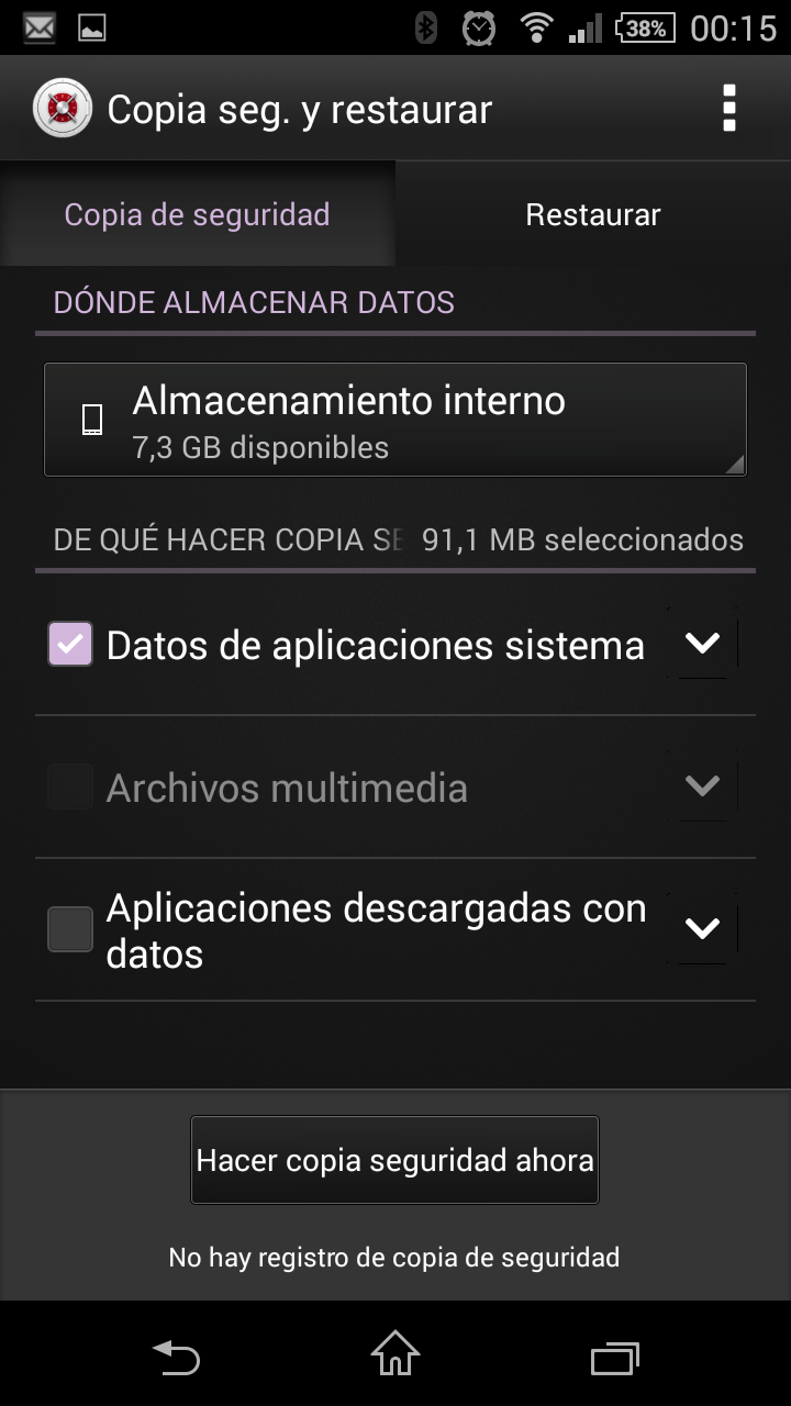 La aplicación Copia de seguridad y restaurar permite hacer una copia de seguridad o restaurar las datos de aplicaciones de sistema, archivos multimedia y aplicaciones descargadas con datos. No es posible programar una copia de seguridad para que se realice en otro momento o periódicamente.