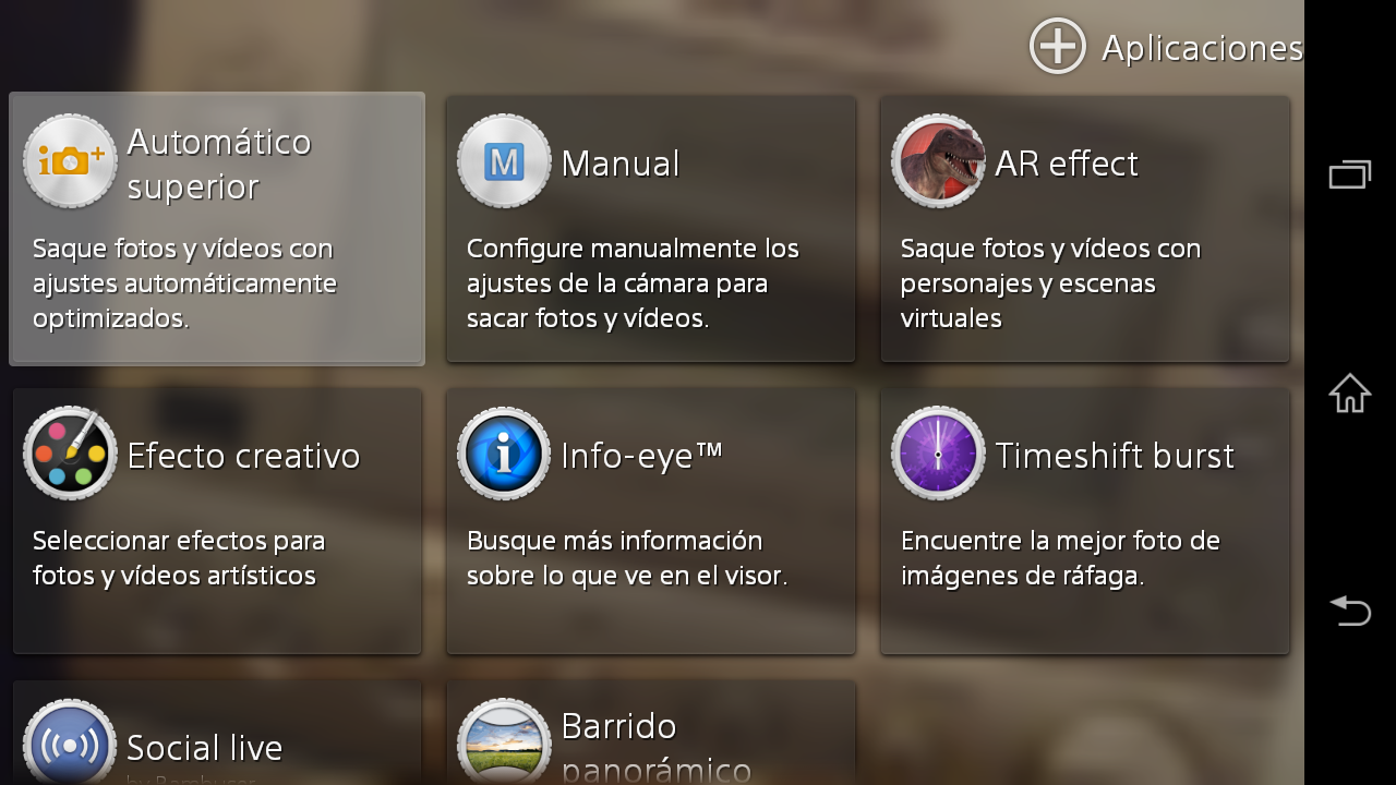 Pulsando sobre el botón de selección de modo accedemos a los diferentes modos: Automático superior, Manual, Timeshift burst, Efecto creativo, Barrido panorámico, AR Effect, Info-eye y Social live. Existe un acceso directo que nos permite añadir nuevos modos, que son descargados de la tienda de aplicaciones Sony Select.
