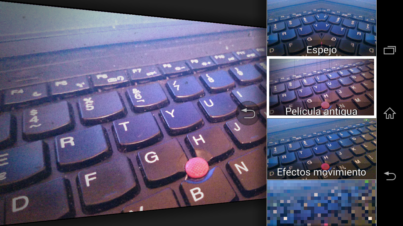 El modo de efecto creativo permite escoger entre multitud de efectos – brillo-contraste, matiz-saturación, espejo, película antigua, efectos movimiento, mosaico, trayectoria, nostálgico, miniatura, intenso, tono, ojo de pez, boceto a color, boceto con lápiz, tira cómica, color parcial, obturador Harris y caleidoscopio – que se aplican y muestran en la pantalla en tiempo real sobre la imagen que captura la cámara.