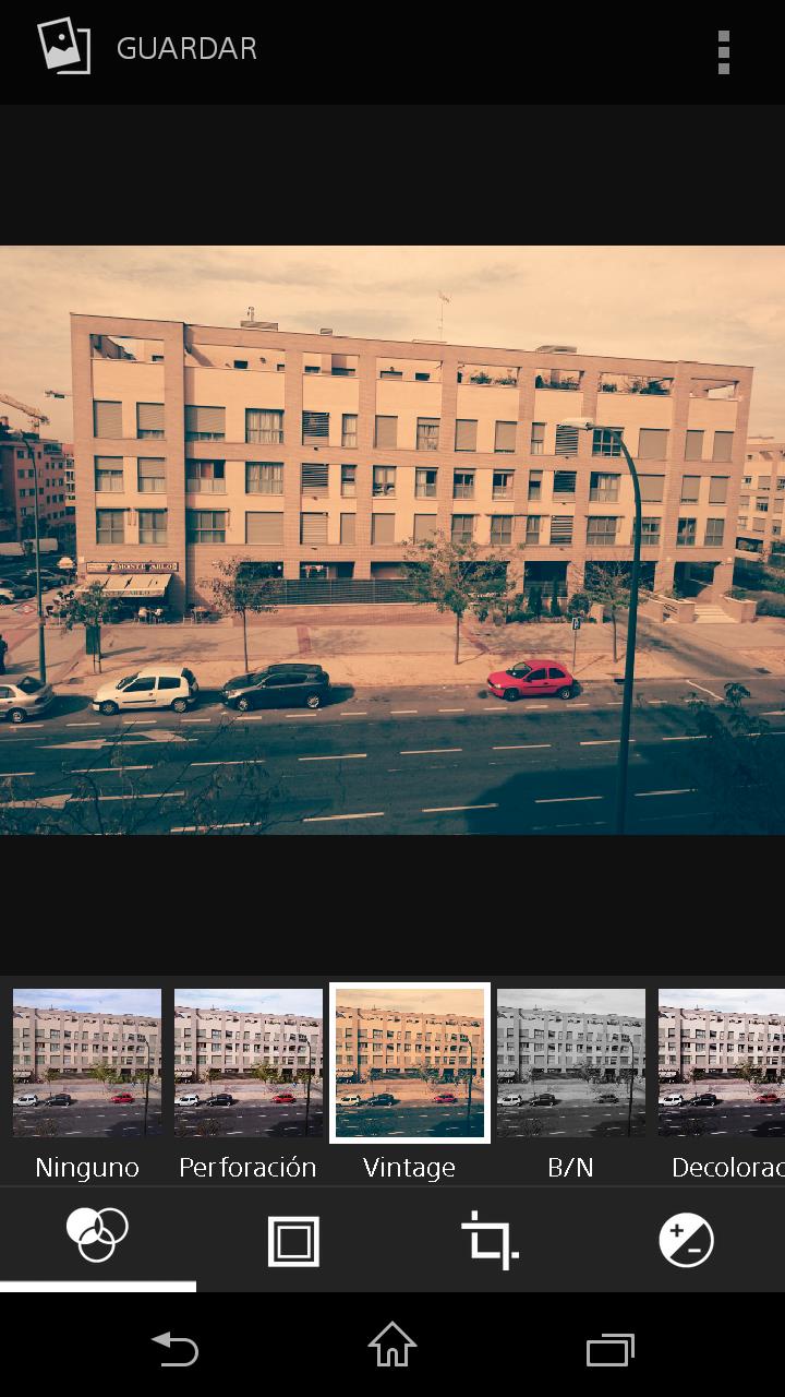 - Efecto creativo permite escoger entre multitud de efectos – brillo-contraste, matiz-saturación, espejo, película antigua, efectos movimiento, mosaico, trayectoria, nostálgico, miniatura, intenso, tono, ojo de pez, boceto a color, boceto con lápiz, tira cómica, color parcial, obturador Harris y caleidoscopio – que se aplican y muestran en la pantalla en tiempo real sobre la imagen que captura la cámara.