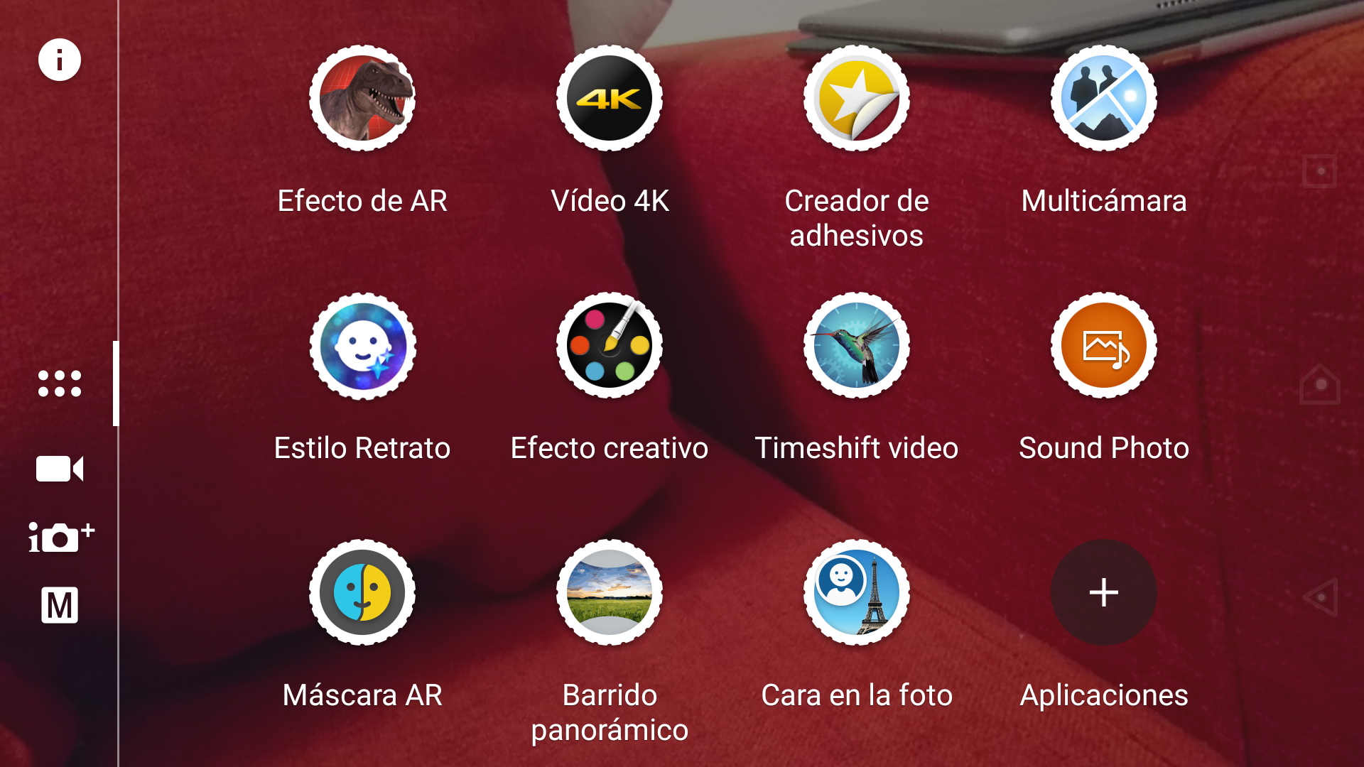 El interfaz de la cámara muestra, a la izquierda, los controles manuales de flash, selección de cámara y acceso rápido a opciones: aplicaciones de cámara, vídeo, automático superior y manual.