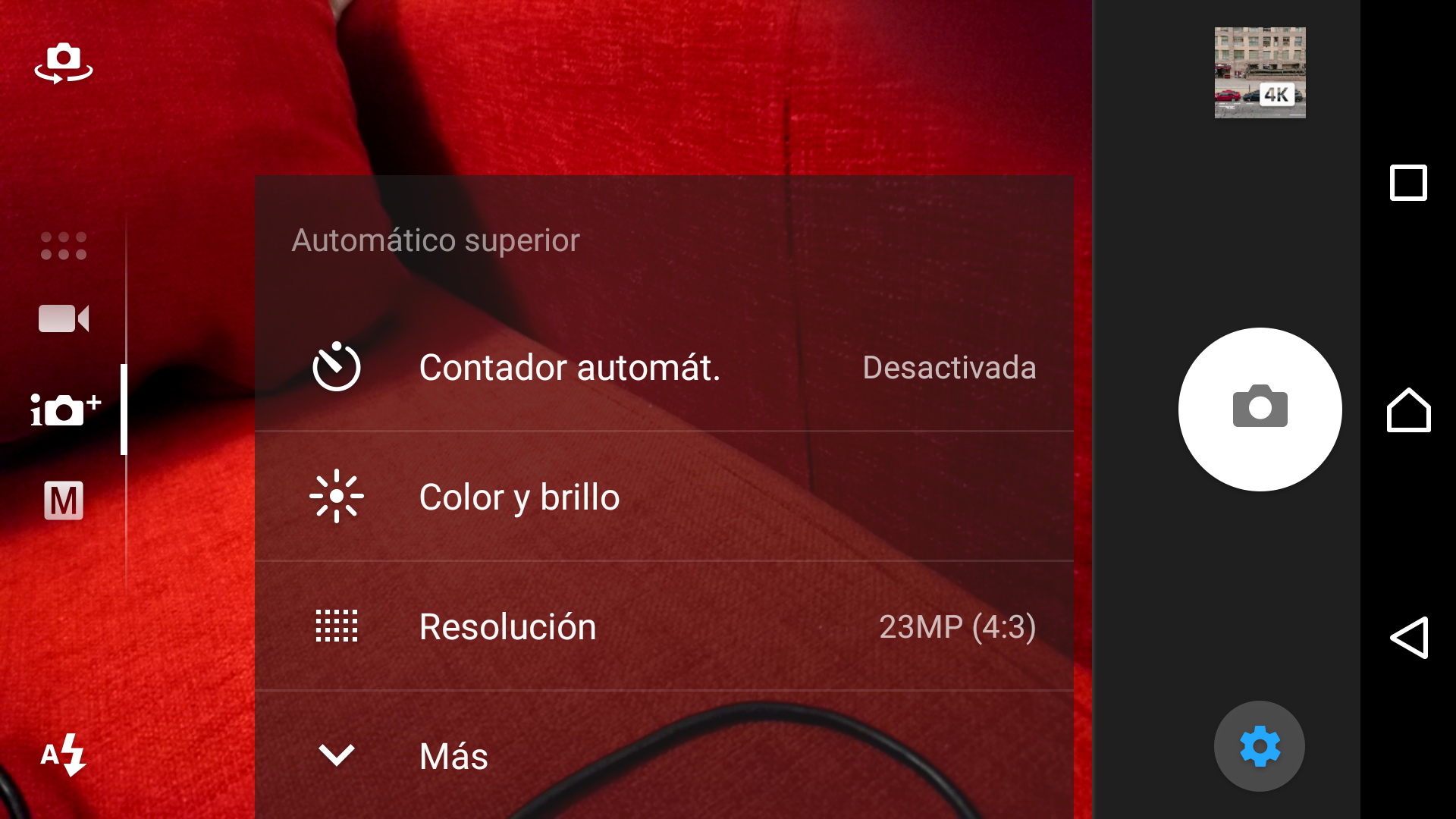 A la derecha encontramos los botones de disparo y ajustes, así como una miniatura de la última fotografía tomada.