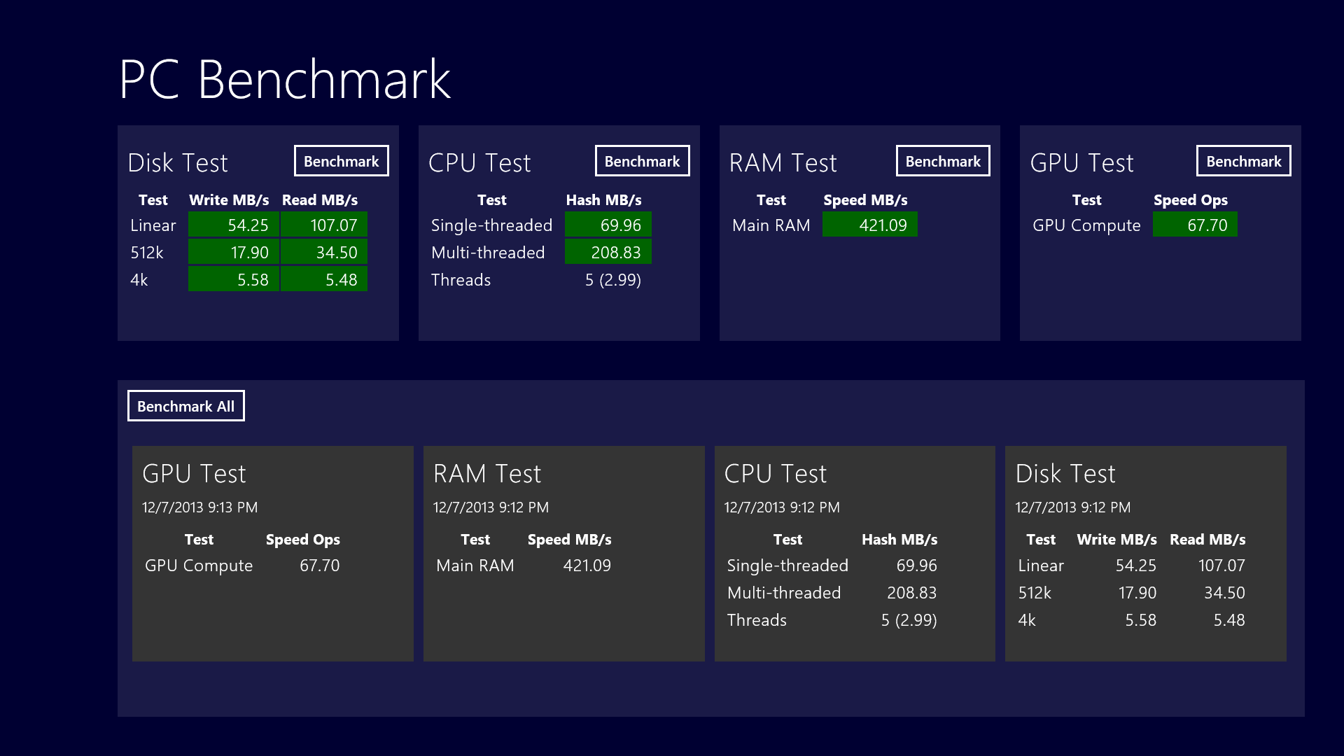 En su ausencia, hemos optado por utilizar PC Benchmark, que prueba la CPU, GPU, RAM y Disco. En comparación con los resultados que obtuvimos cuando analizamos el tablet Surface RT, el rendimiento ha mejorado significativamente en todos los aspectos.