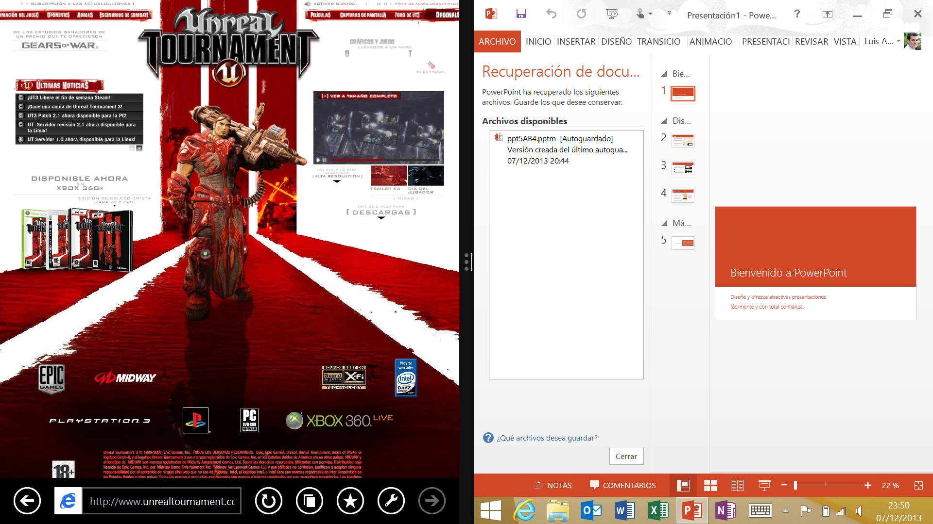 Si mantenemos el dedo pulsado sobre una de estas aplicaciones en miniatura y la arrastramos a la parte izquierda o derecha de la pantalla, esta se dividirá verticalmente y podremos utilizar dos aplicaciones a la vez. Como novedad en Windows RT 8.1, es posible modificar la anchura que ocupa cada aplicación y ya no es necesario que cada una ocupe exactamente la mitad.