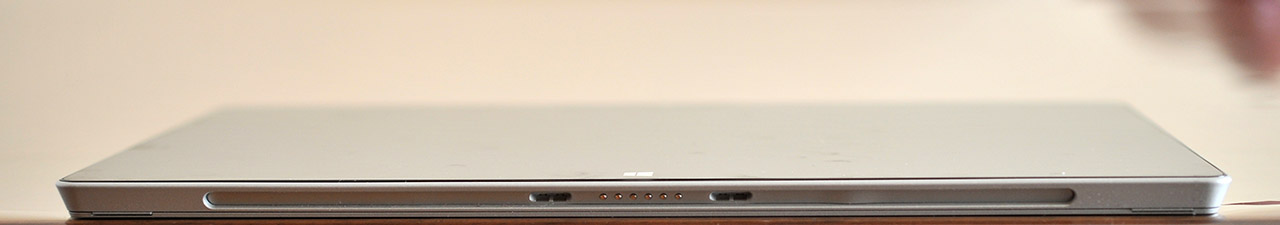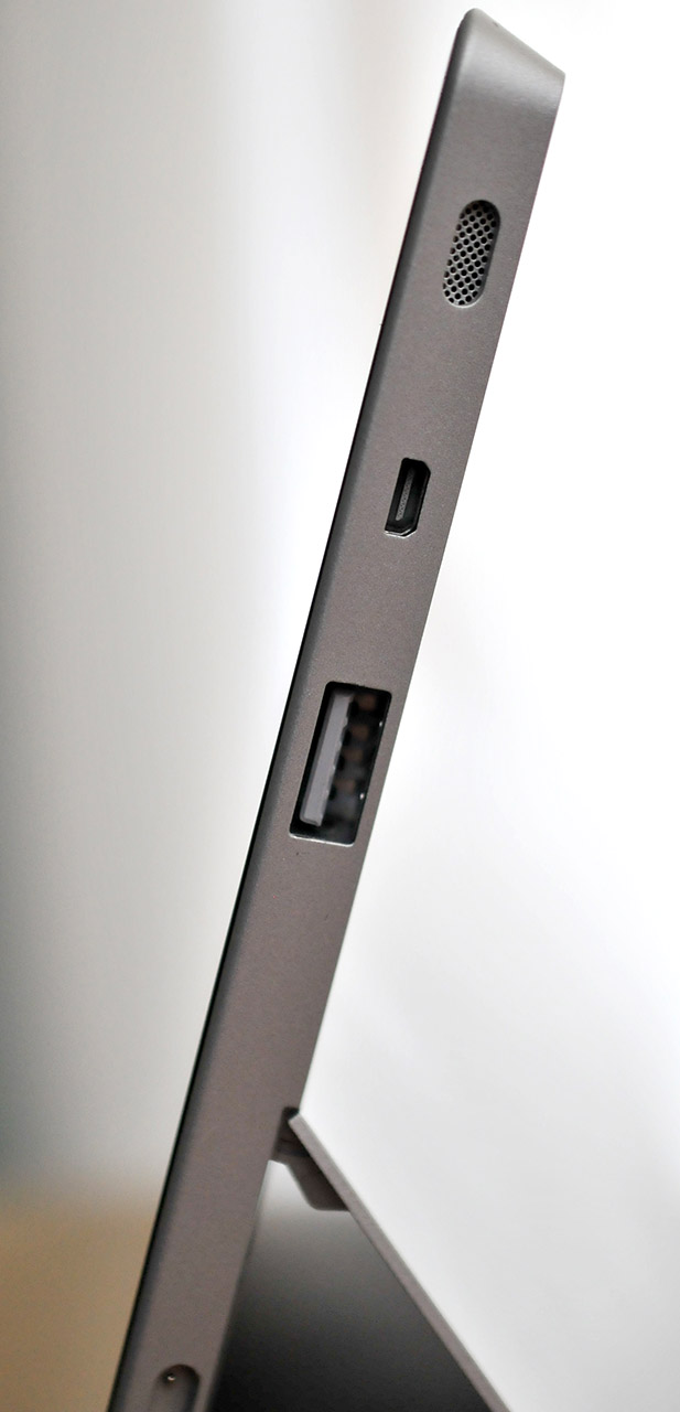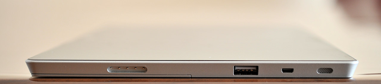 En el lateral derecho encontramos un puerto USB 3.0 convencional, un conector micro-HDMI, la rejilla del altavoz derecho y un extraño conector de alimentación con cinco contactos metálicos que sigue resultando bastante complicado de acoplar.