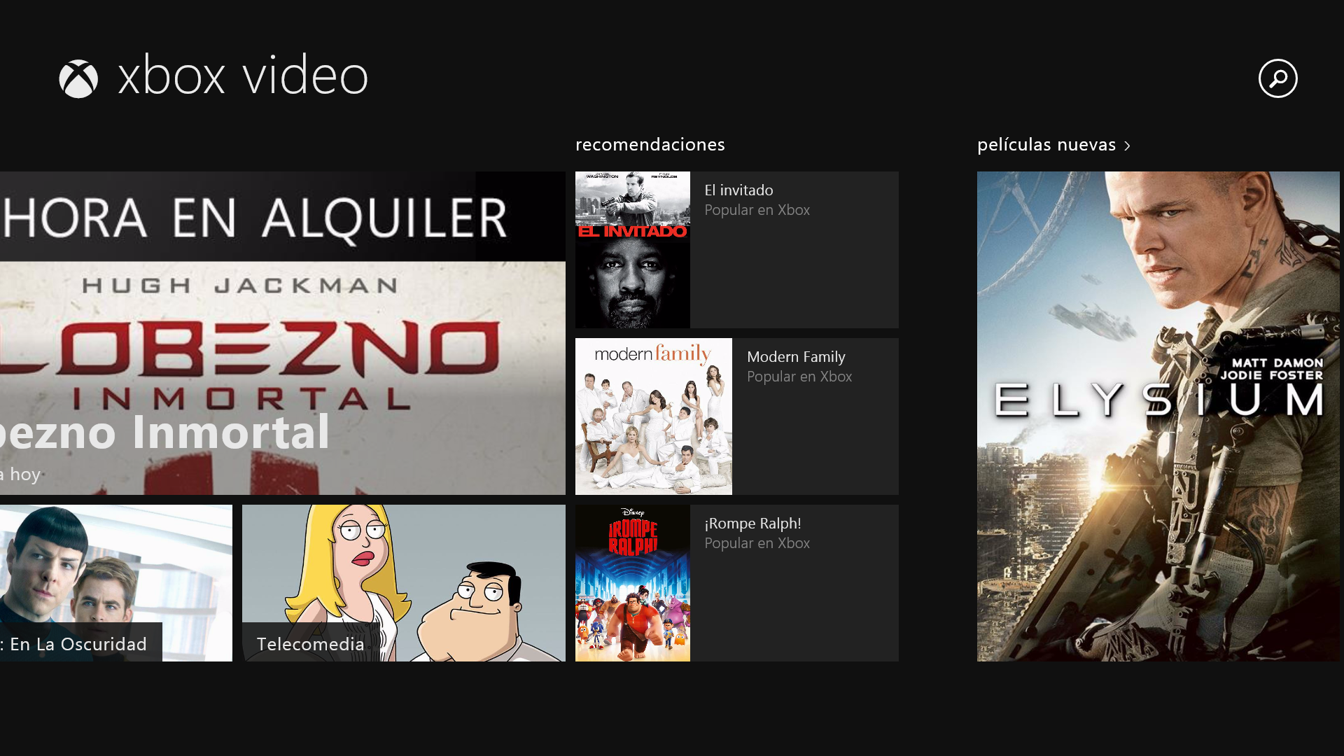 Además de reproducir ficheros locales Xbox Video ofrece, como comentábamos anteriormente, la reproducción de contenidos de vídeo a través de Internet. Un estreno como Aviones puede comprarse en HD por 18 € y en SD or 15 €, y alquilarse en HD por 5 € y en SD por 4 €. Una temporada completa de una serie como Modern Family cuesta 36 € en HD y 31 € en SD.